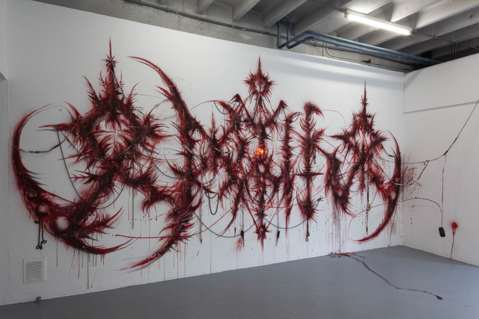 De son côté, l’artiste italien ᛟᛞᛁᚾᛟ, inscrit ses peintures dans les courants post graffiti, anti-style ou encore post vandalisme. Démarré en 2020, ce projet pictural s’est développé au-delà du nord de l’Italie. Éloigées de la culture hip hop du graffiti classique, les peintures d’ᛟᛞᛁᚾᛟ se nourrissent de l’esthétique acérée et païenne du black metal accompagnée de la vision surréaliste de la mythologie scandinave.