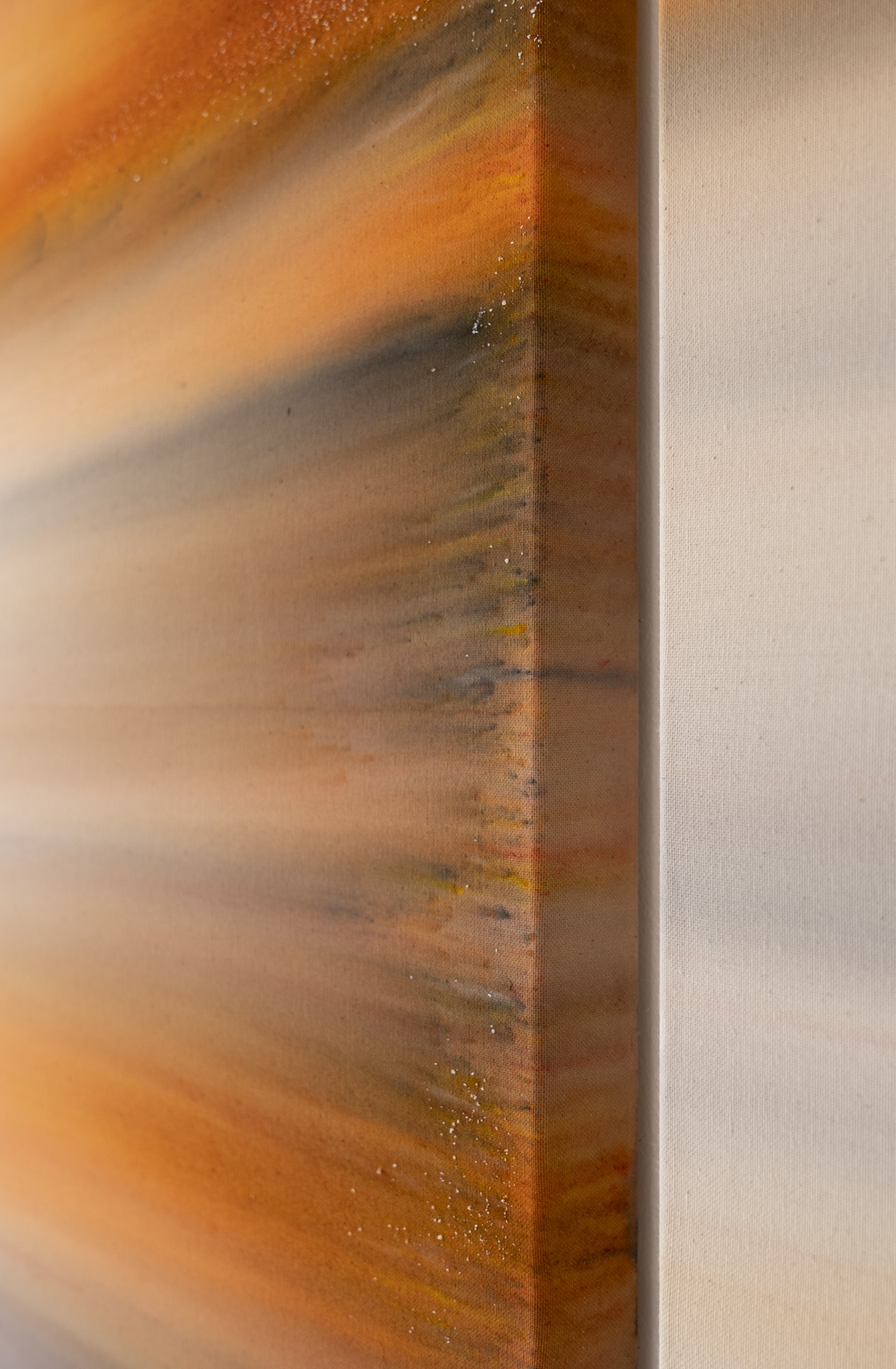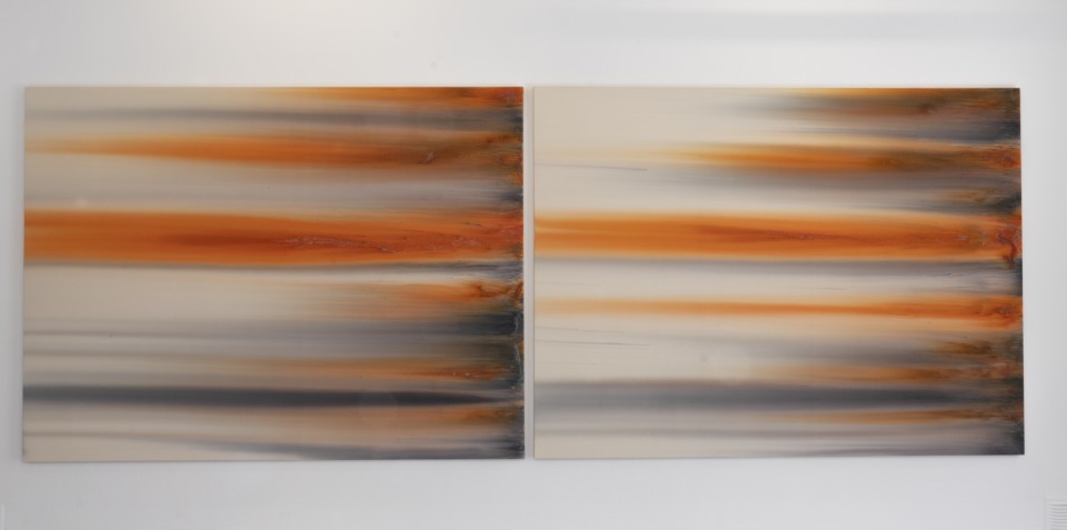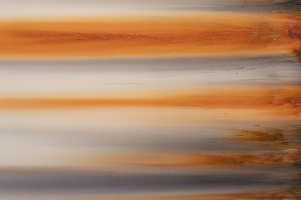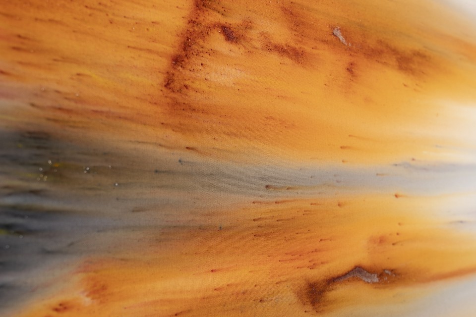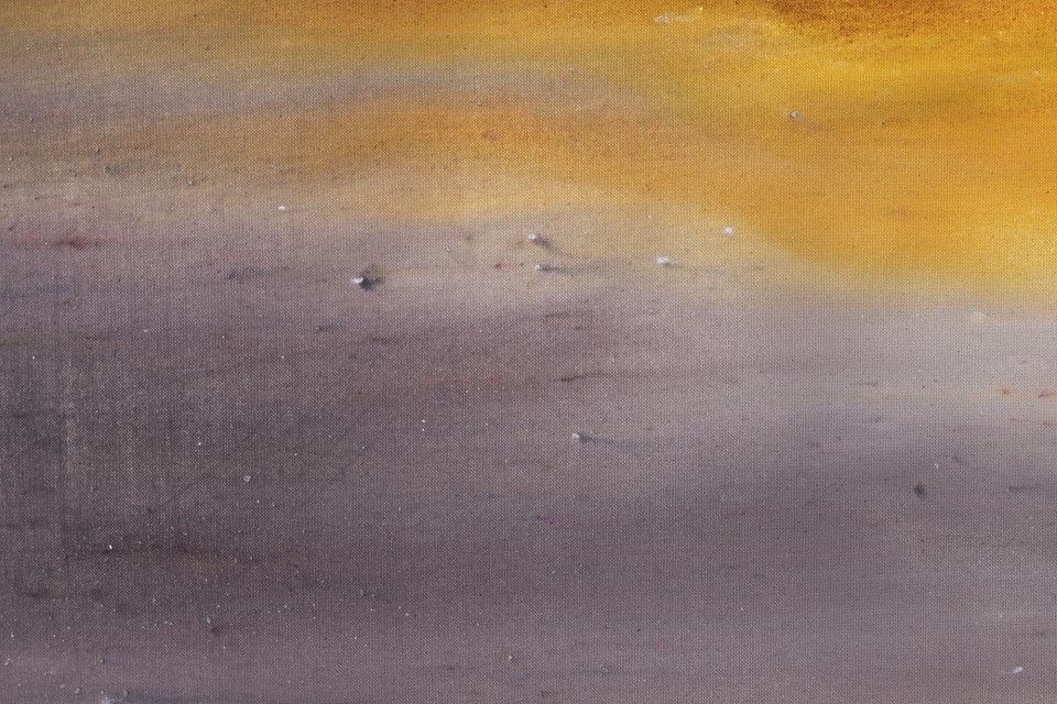 Lorsque l’on voit de près ces tableaux peints, ou plutôt teints et déteints, l’une des premières surprises