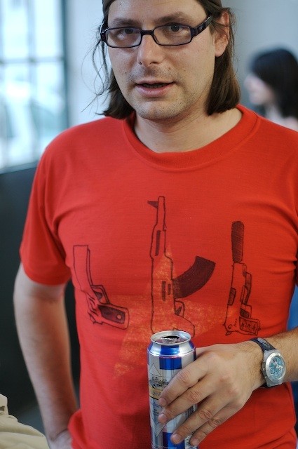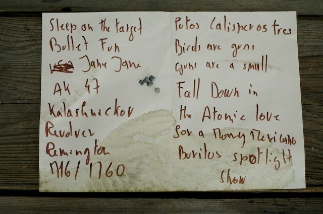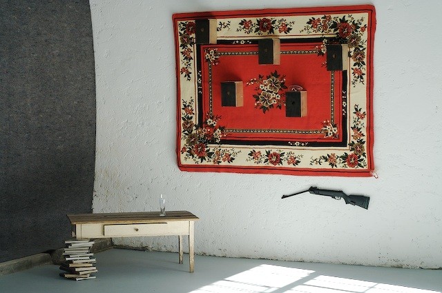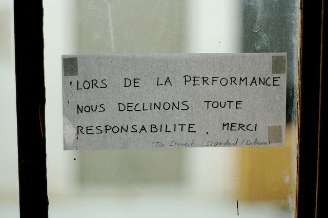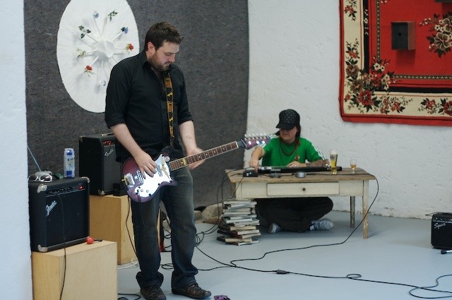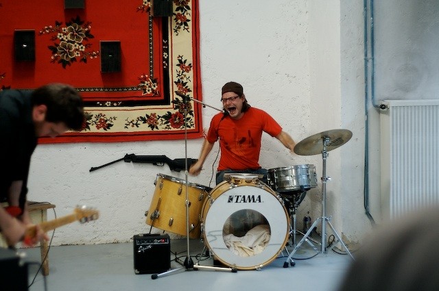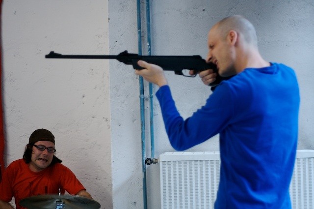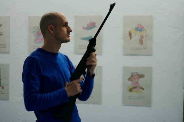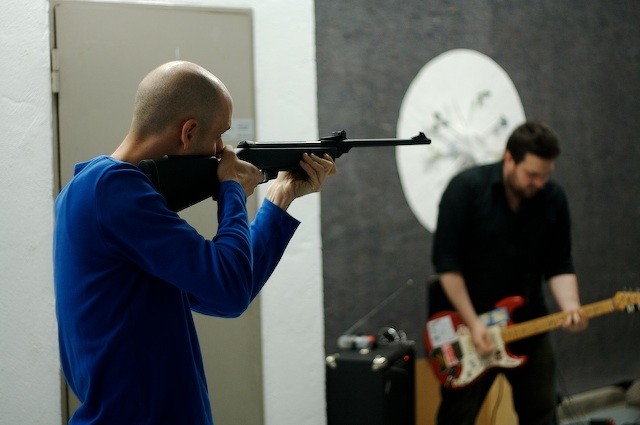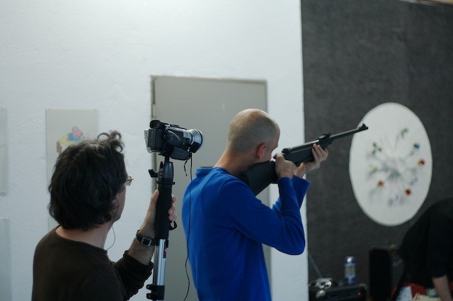 « LE LANGAGE ARTISTIQUE COMME CIBLE, COMME ARME »Tilo Steireif expose ses dessins, propose une installation et convoque pour une performance un groupe de Hardrock pour un duel en public. Le groupe Los Tres Putos est en soi un concept du fait que les trois musiciens appliquent plus d’une dizaine de dogmes.Tilo Steireif tire à la carabine en direction du groupe en plein concert. Ce dernier est placé dans une installation qui fait allusion au Luna Park. Elle est constituée d’une cible circulaire en plâtre et fleurs en plastique, d’une table basse et d’un verre à bière et de 6 boîtes cibles en bois qui cachent des cannettes de bière. Le public est composé d’amateurs de musique Hard. Les coups de fusils partent pour toucher les cibles placées derrières les musiciens. Il n’y a pas de séparation entre la scène et le public, ni entre eux et l’artiste. La réaction du public suit lorsqu’une cible est touchée reléguant la performance musicale au second plan. Ce va et vient de l’attention du public instaure un effet de malaise dans la réception de la production artistique.En 1987, Hal Foster pour un catalogue du centre George Pompidou nommé « L’Epoque, la mode, la morale et la passion » à propos d’une nouvelle génération d’artistes (Sherry Levine, Martha Rosler, Barbara Kruger ou encore Allan MC Collum) : « Chacun traite l’espace public, la représentation sociale ou le langage artistique dans lequel il/elle intervient, à la fois comme cible et comme arme ».Vingt ans plus tard, ces travaux sont muséifiés, nous paraissent hégémoniques dans la forme et ont été absorbés par l’économie marchande. Tilo Steireif crée une série d’allégories qui font allusion à la critique institutionnelle sous forme de dessins, d’installations et de performances. Elles sont vraisemblablement moins efficaces et d’une autre échelle, plus précaires et disséminées. Mais en étant multiformes et en évitant toute édification, elles peuvent s’infiltrer partout.