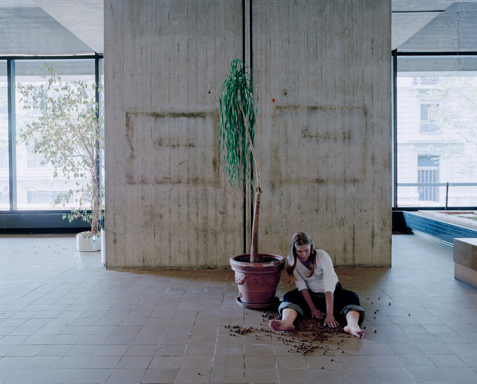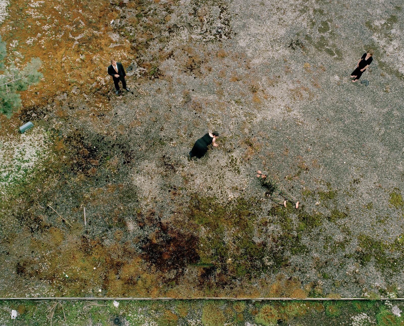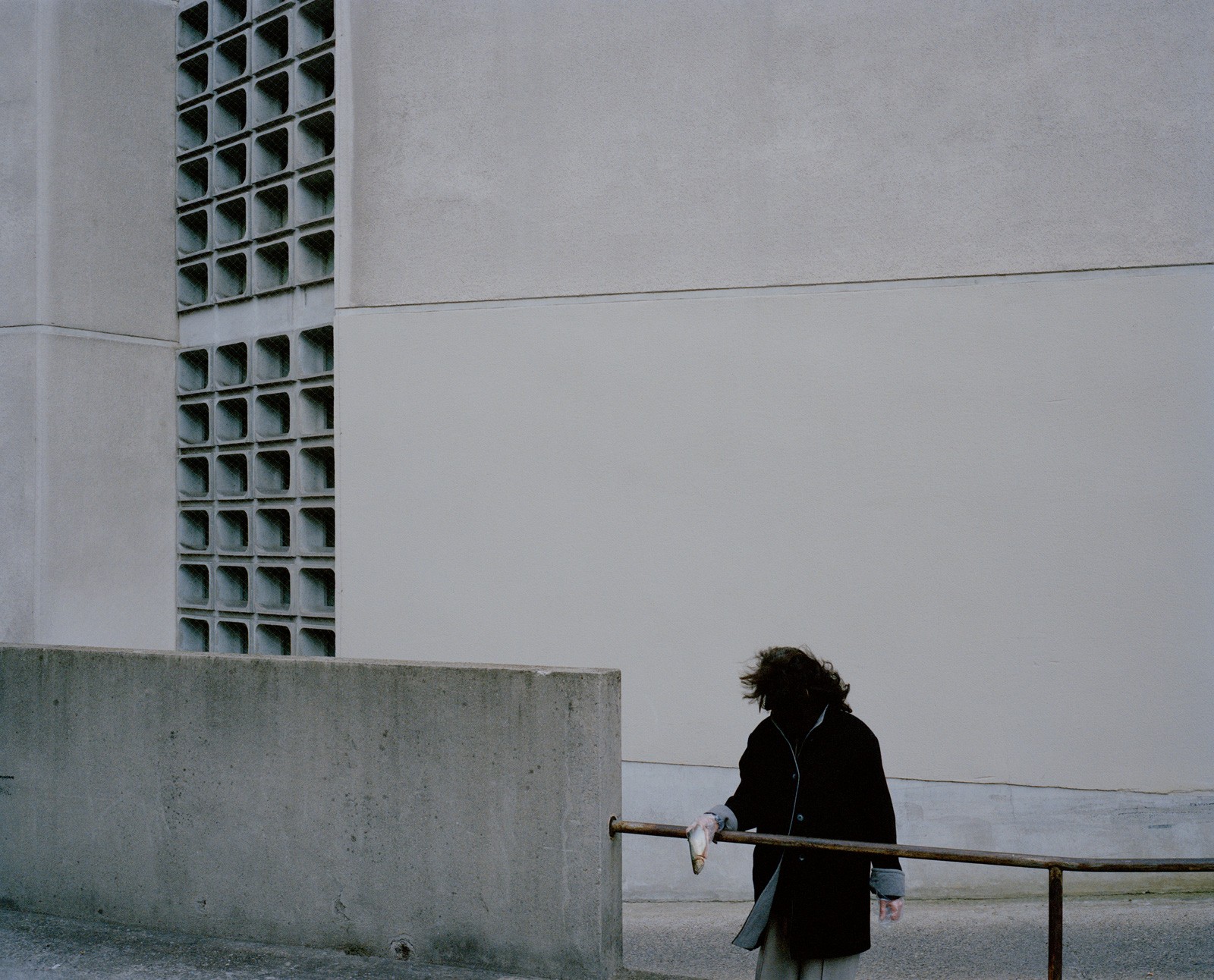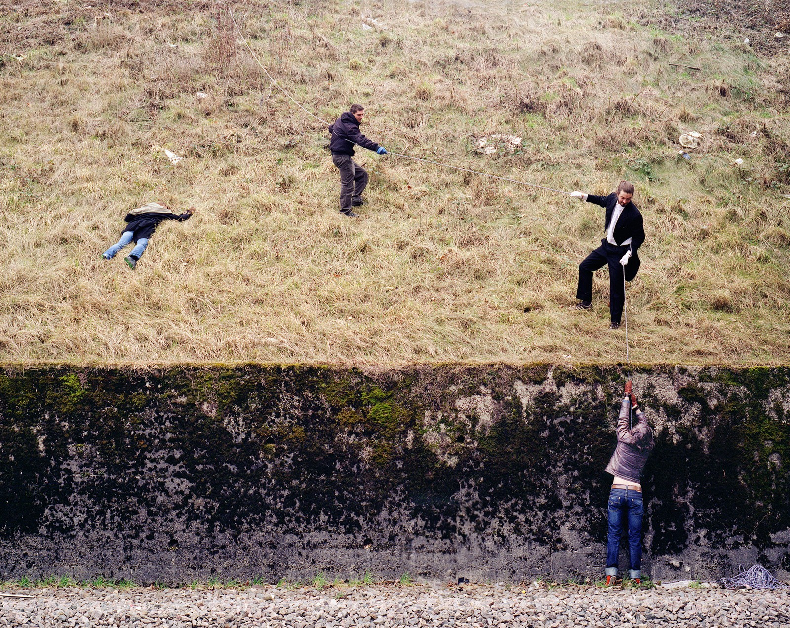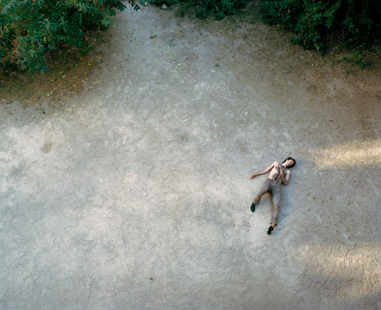 Ce travail est une tentative de projection de mon imaginaire dans des espaces urbains qui m’interpellent. Ces lieux deviennent des sortes de décors à mes mises en scènes, interagissant avec les figurants. Ces espaces m’attirent soit pour leurs aspects de naturel construit (ou d’artifice naturel), soit pour leur rapport ambigu entre loisir et violence. Je souhaite intriguer et instaurer le doute chez le spectateur sur la vrai-semblance des images en montrant tout l’artifice qui peut se cacher derrière une photographie à l’apparence trompeuse. Mes images sont entièrement construites afin de servir mon propos, je ne suis pas seulement spectatrice du monde extérieure. Je recrée une sorte de monde imagé où l’être humain n’est pas toujours à la place qu’on attend, ni en train de faire une action dite sensée. Mon but est de créer une tension tangible dans mes images, comme si on assistait à l’instant précédant la tragédie. Mes photographies évoluent entre absurdité et gravité. Je recherche à créer des actions figées dans une sorte de suspens crée par l’expression des visages et des corps. Les dissonances sont voulues afin de suggérer une narration possible, un avant et un après l’image. Début, fin ou suite d’une histoire à s’inventer.