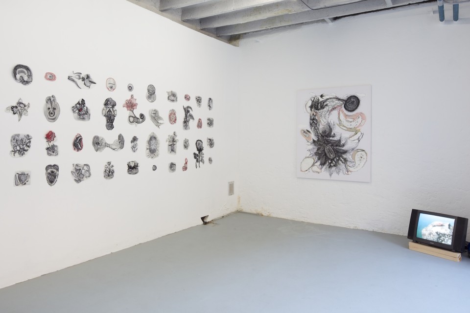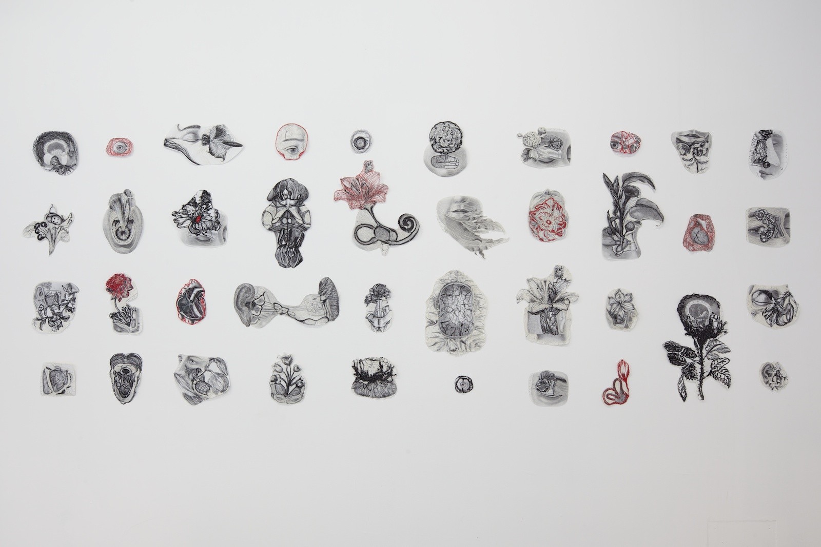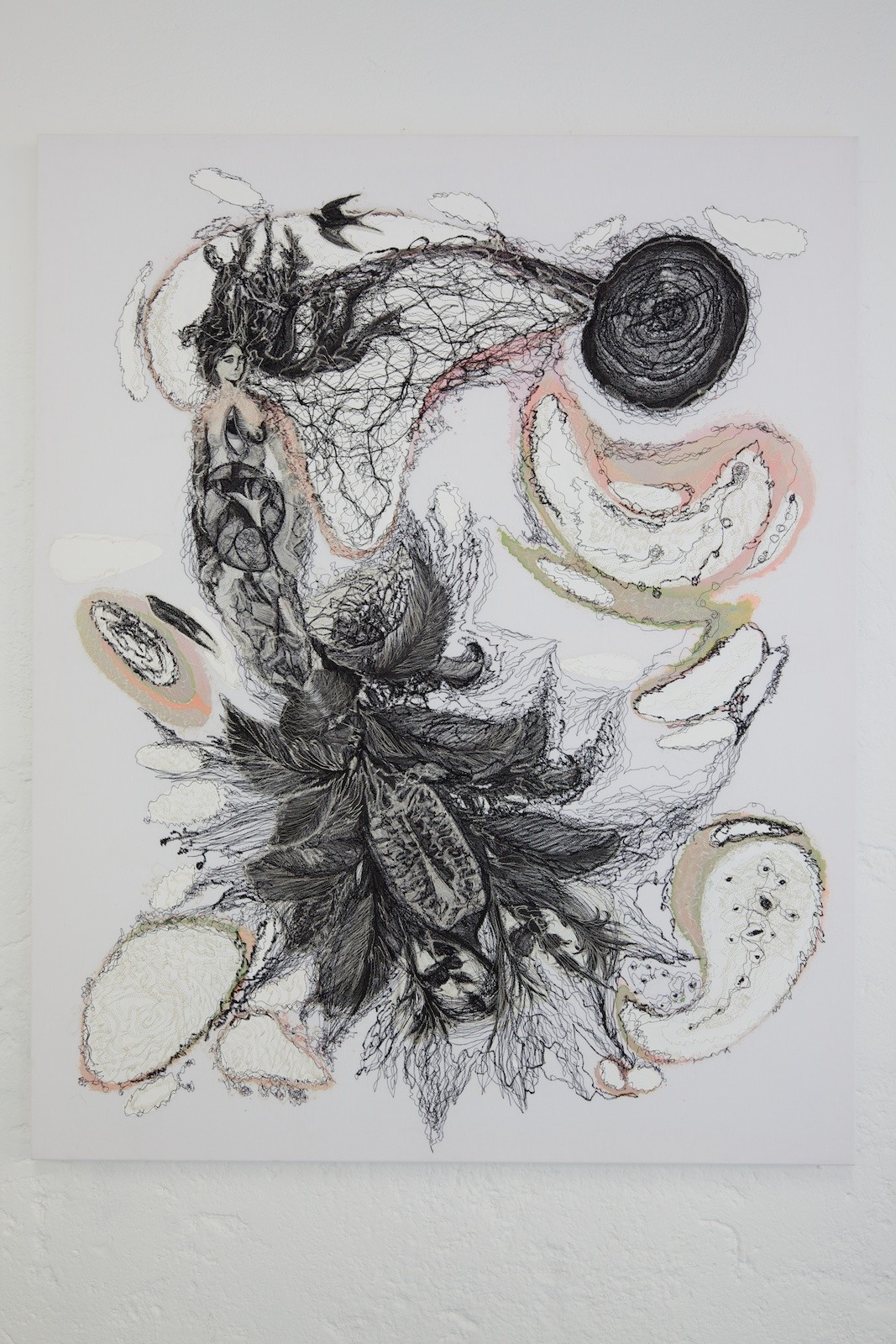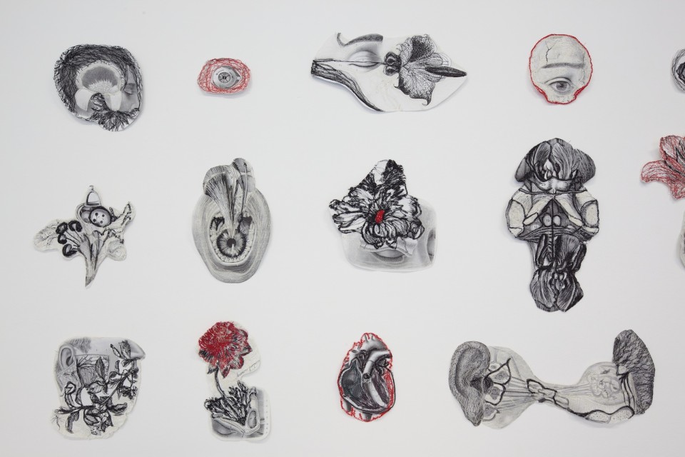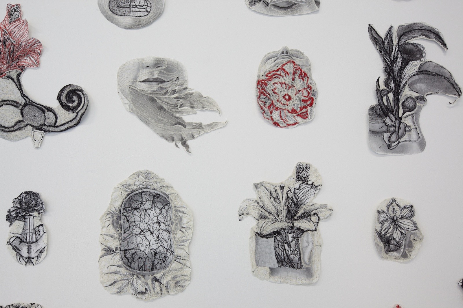 Liliana Gassiot brode, découpe l’imagerie d’un monde intime. Hybride, le corps disparaît laissant derrière lui une structure, une peau couverte d’écailles, fils fragile et tendus.
