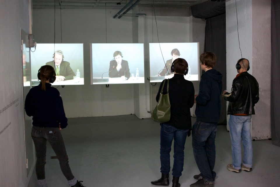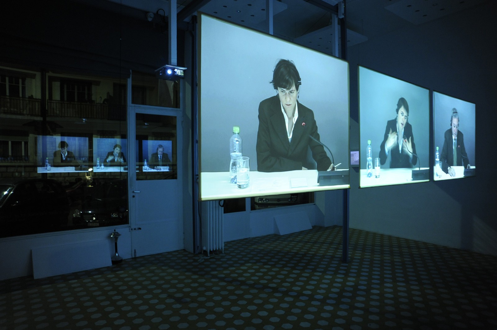 Dans cette installation vidéo, des interprètes, qui oeuvrent habituellement dans l’ombre de diplomates et de politiciens restituent la conversation entre un soldat américain qui revient d’Irak, une propriétaire d’hôtel et une vendeuse de voitures. A l'image du traducteur, le spectateur n'entendra que des réponses isolées et prend acte d'un réel en lien avec la guerre, mais fragmenté, loin des évocations spectaculaires qu'en font les journaux. Il est ici question de la langue en tant qu’outil, des enjeux et des conséquences de son maniement, notamment dans le champ politique.