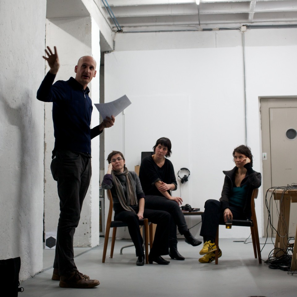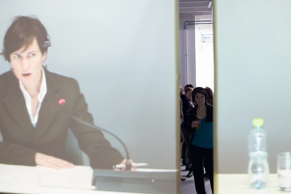 On ne peut pas alors ne pas penser à l’ordinaire du travail des interprètes, plus habitués à retranscrire les échanges de diplomates dans des réunions internationales. Ils se retrouvent là mis en lumière à donner corps à une conversation à trois voix entremêlées. L’opération simple mais efficace de Gabriela Löffel est de les séparer et de ne faire entendre qu’une à une les traductions françaises de chacun des locuteurs originaux. La discussion perd alors sa qualité d’échange, les positions se figent en même temps que se défait le discours dans la mesure où nous n’avons pas accès en direct aux réponses et réactions des autres. Seuls nous parviennent, sans pouvoir réellement les suivre, des bribes de ce que le voisin de box traduit.