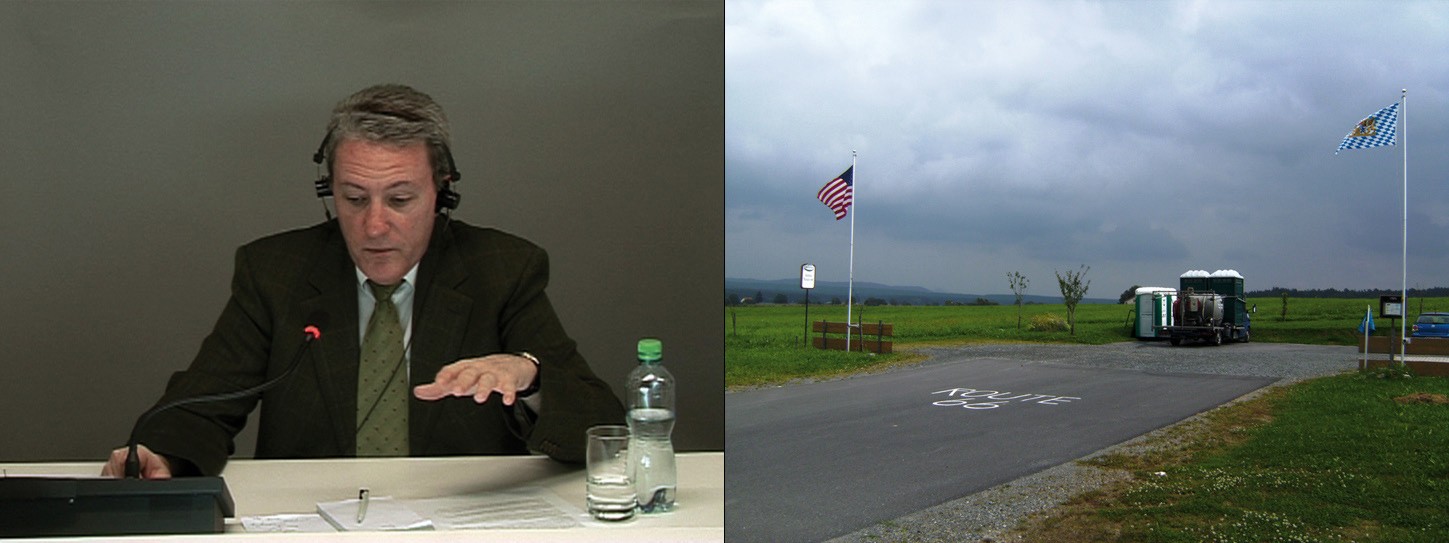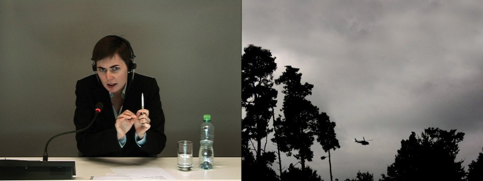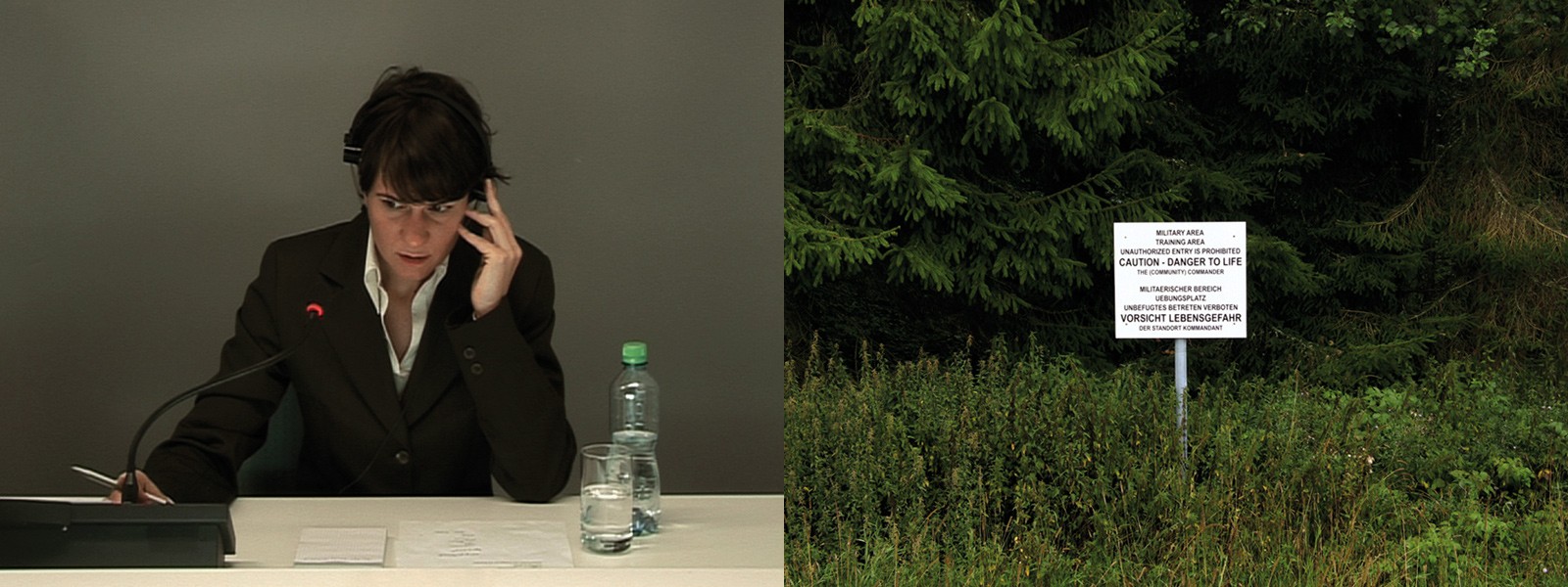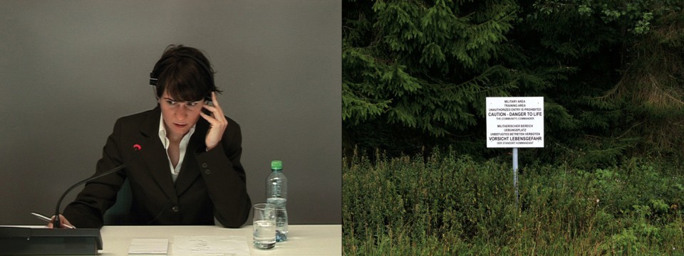 Le camp apparaît comme le fondement de ce dernier travail de Gabriela Löffel et permet d’articuler une réflexion autour de la parole dans la vie de tous les jours comme dans les sphères moins accessibles des cercles de décisions internationaux. Mais revenons au camp et ce qui semble se nouer autour de ses limites : une frontière entre les espaces de la guerre et du quotidien, entre une juridiction militaire et une juridiction civile ; un univers où la vie est mise en jeu pour essayer de préserver cette même vie. La ligne de démarcation entre ces différents espaces ne suit pas scrupuleusement les fils de fers barbelés qui empêchent les civils de pénétrer dans la base, elle est perméable. Si on ne peut pas y pénétrer sans autorisation, quelque chose du camp en sort et réorganise la vie dans les environs proches. De plus, une des justifications de ce camp américain en territoire allemand, de nos jours, répond à une logique d’exception et d’urgence : les guerres qui ont été qualifiées de préventives (ou froides si on regarde un peu plus loin), où la question de l’insécurité amène à revoir le droit international. Et c’est bien en partant du camp, de ses ambiguïtés et de ses frontières que l’artiste a conçu cette installation vidéo.