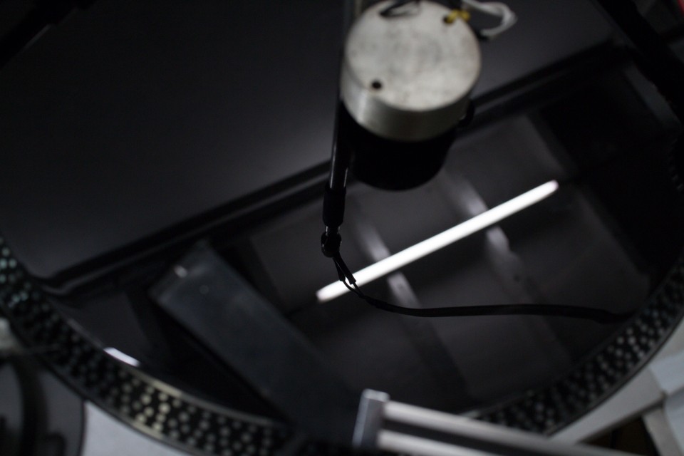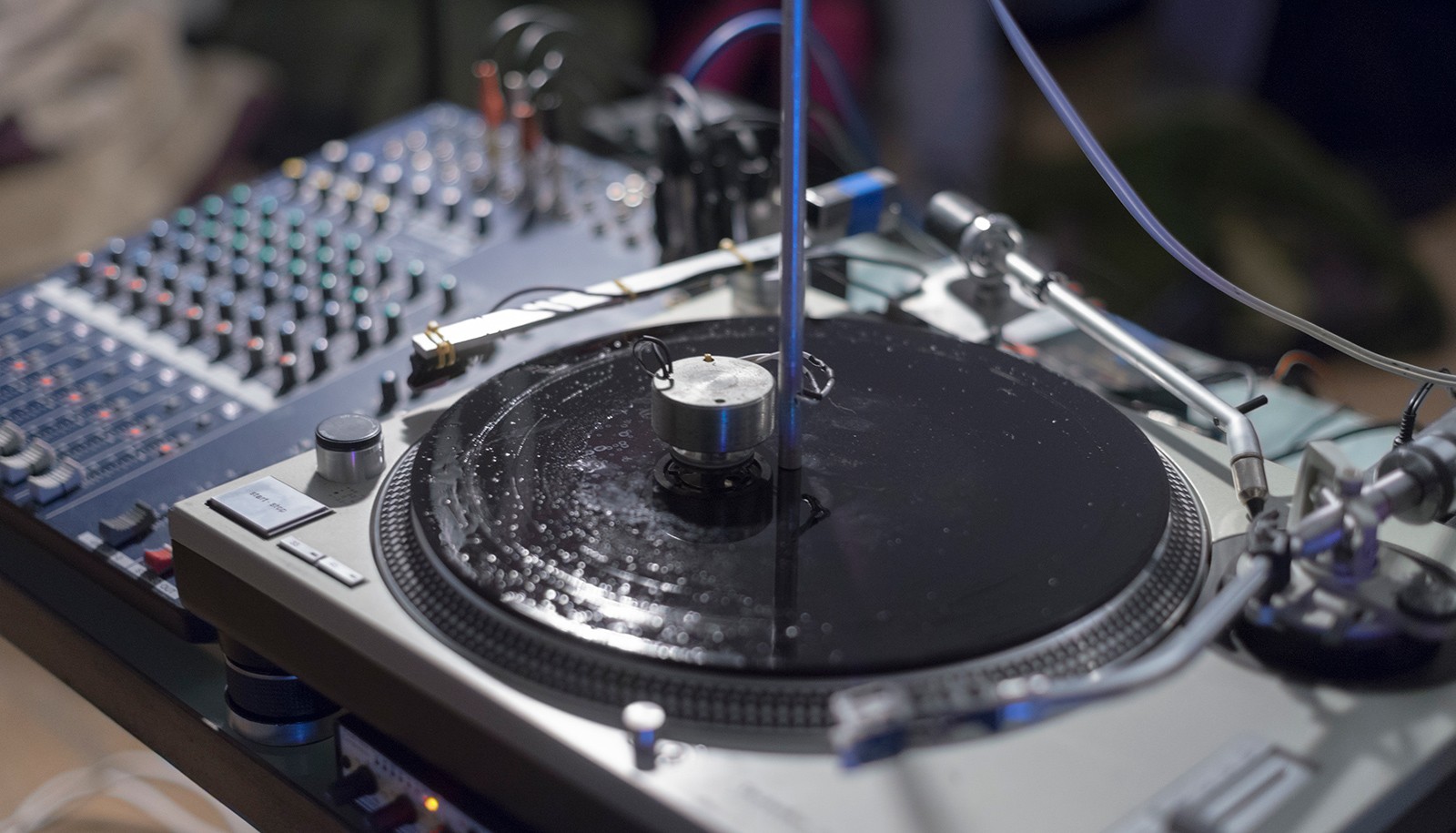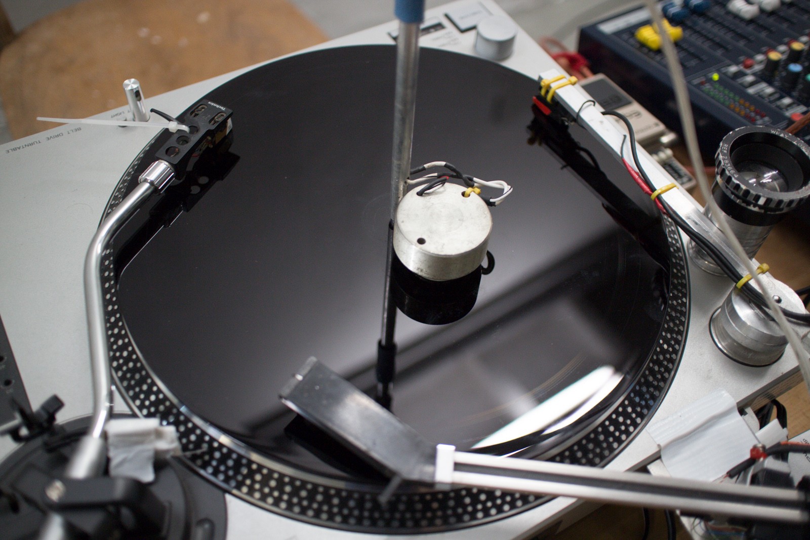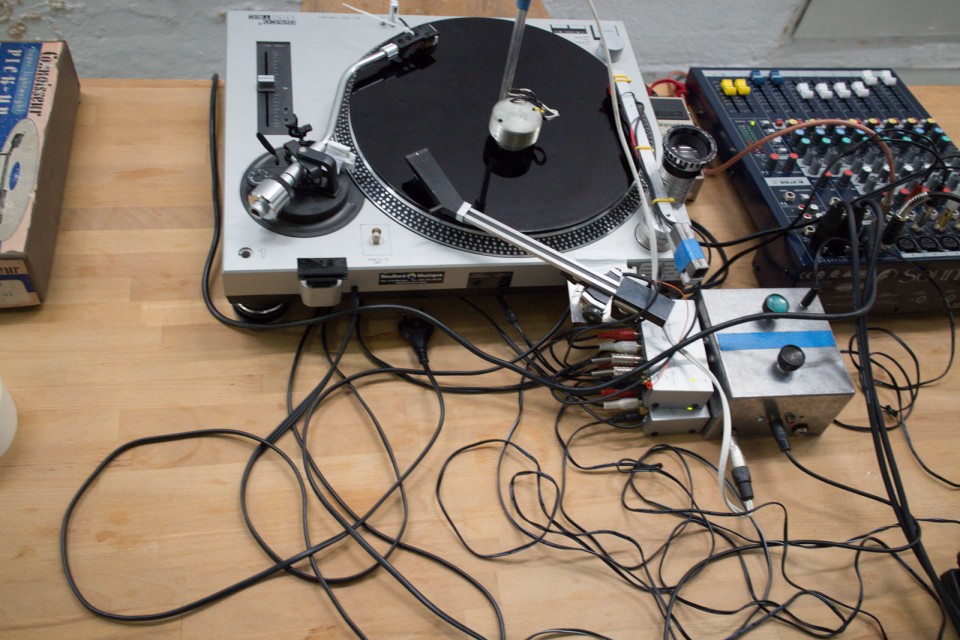 Cette performance utilise un laque de gravure : un disque vierge sur lequel un nouvel enregistrement est coupé avant de le presser sur un disque en vinyle.