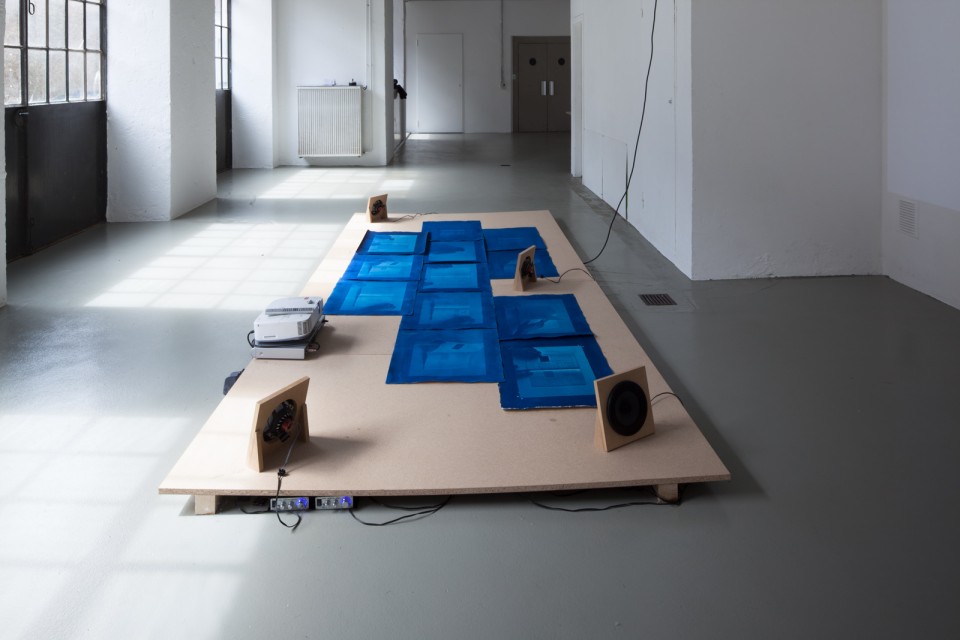 Dans ce travail, l'horizontalité de l'installation est au cœur de l'expérience. Nos yeux sont attirés par elle. Ce que nous voyons est une «sculpture de table» ou installation, où toute la technologie est visible, où rien n’est caché.
