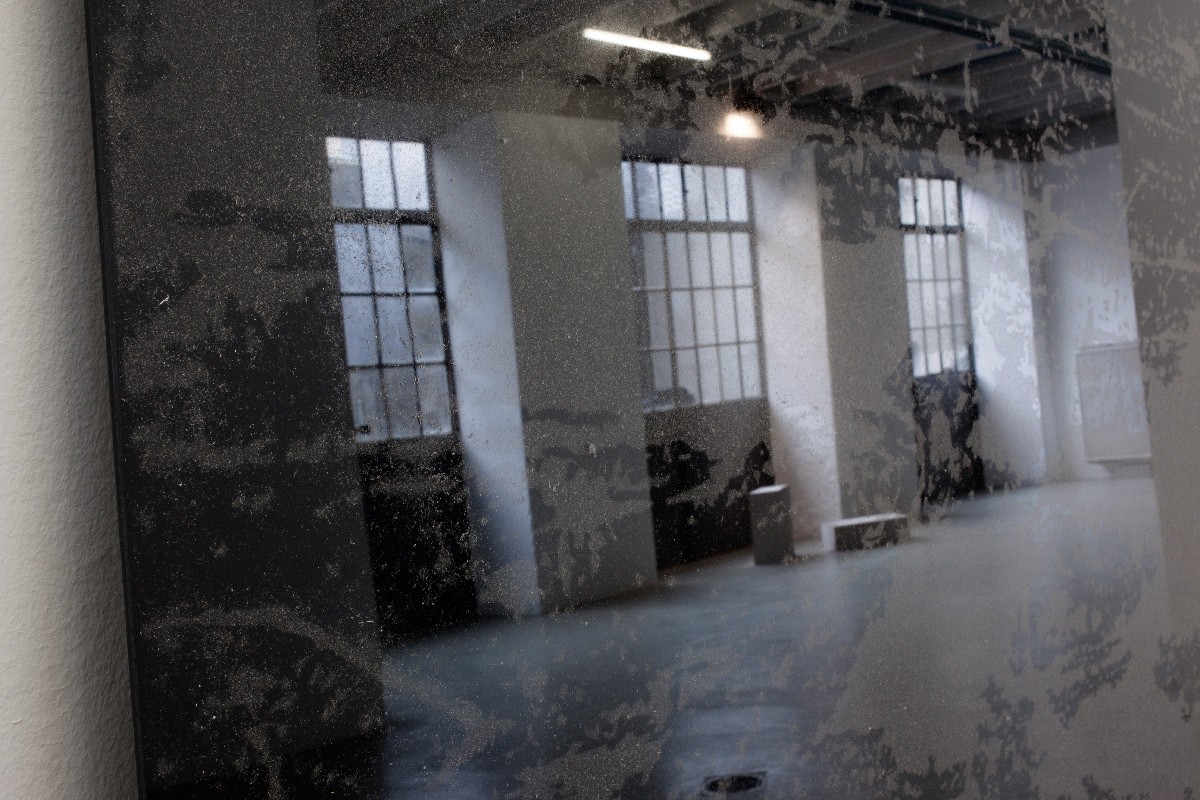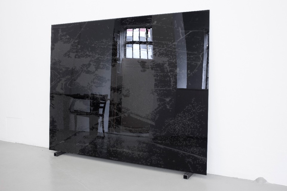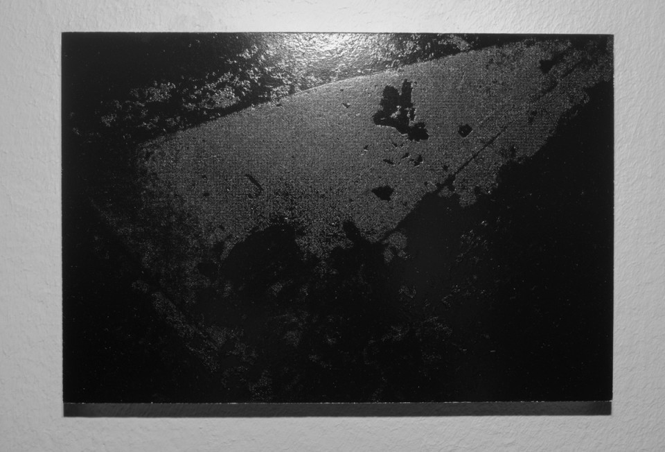 L’image est subtilement mise en espace, elle est découpée, rehaussée de poussière, éclairée, juste décalée du mur, elle perd sa bi-dimentionnalité pour nous suggérer une autre dimension, une dimension mentale.