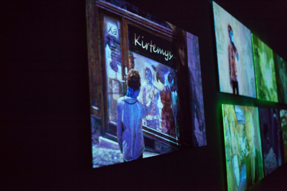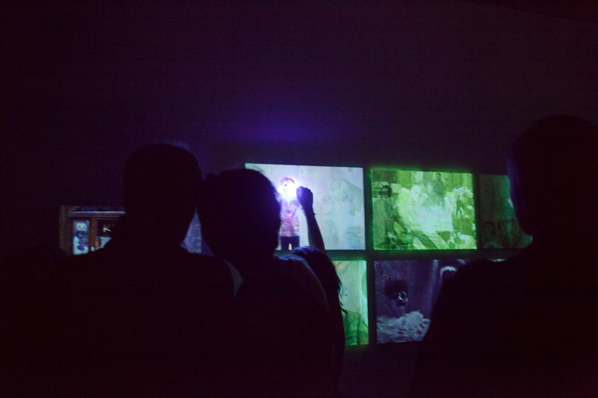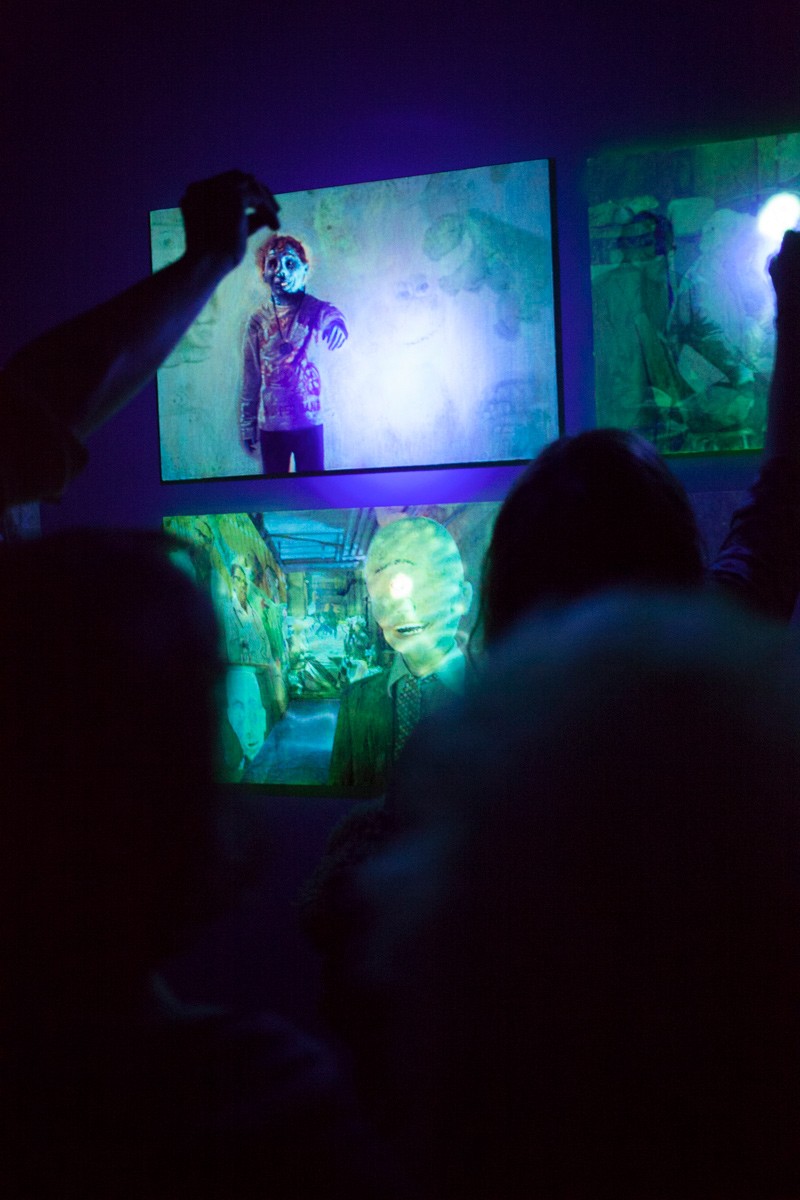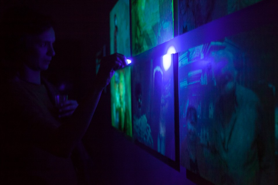 10A rue du Théâtre Booléen présenté à standard/deluxe prend la forme d’une galerie de tableaux accrochés au murs et dont la particularité de ceux-là est qu’ils se rendent visibles dans le noir, en raison de la nature phosphorescentes des pigments qui composent leur peinture. En noir et blanc sous la lumière du jour, en couleur dans la nuit.