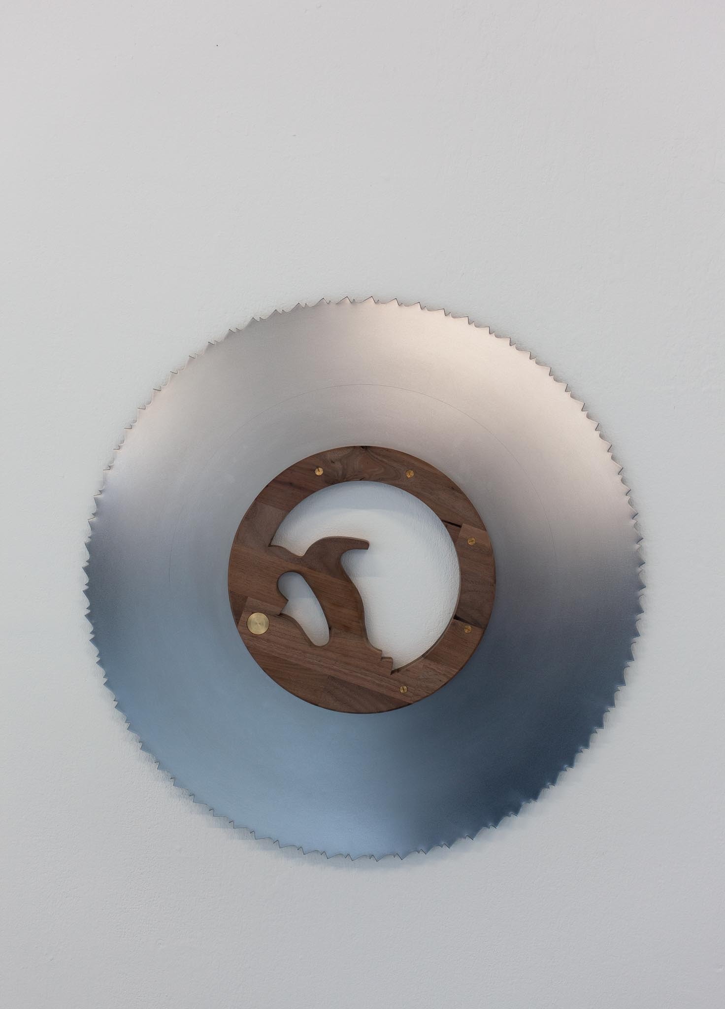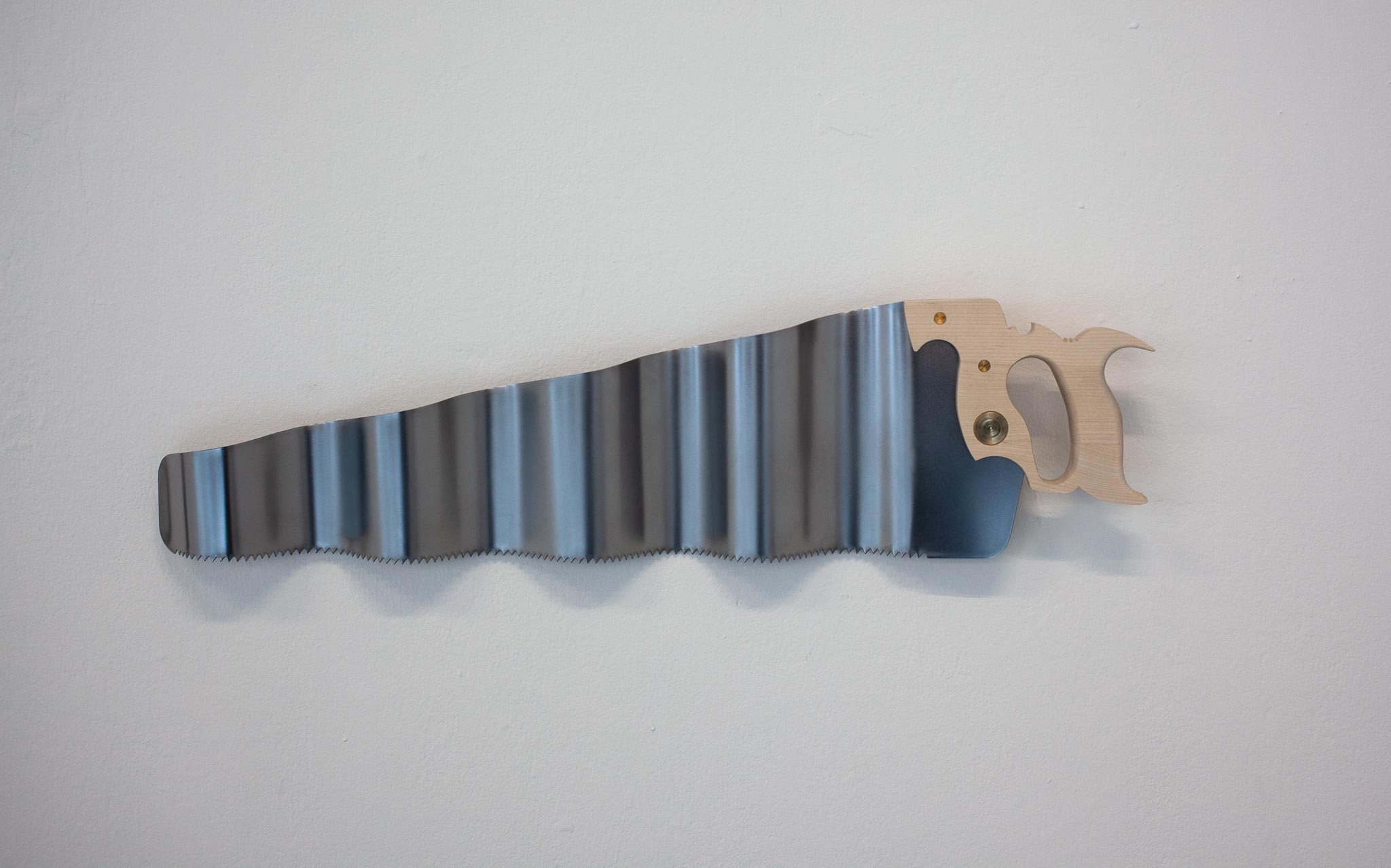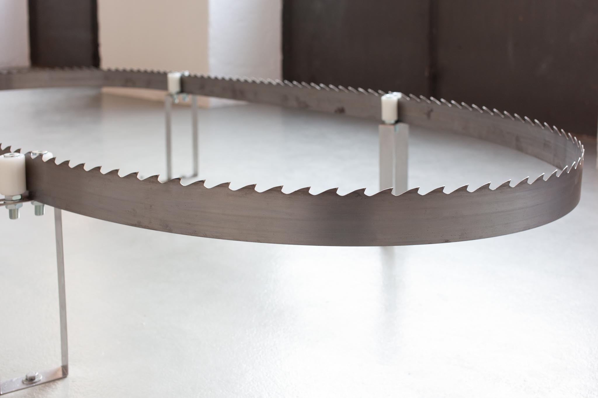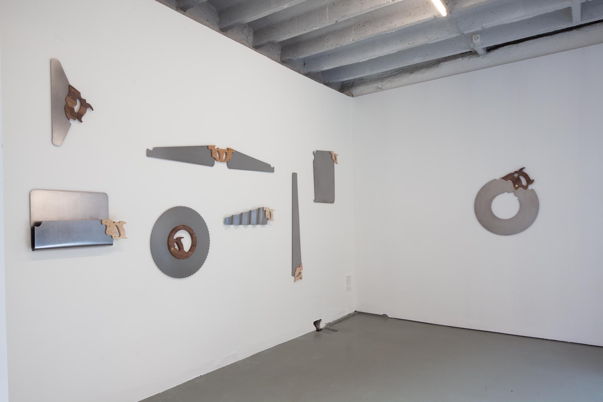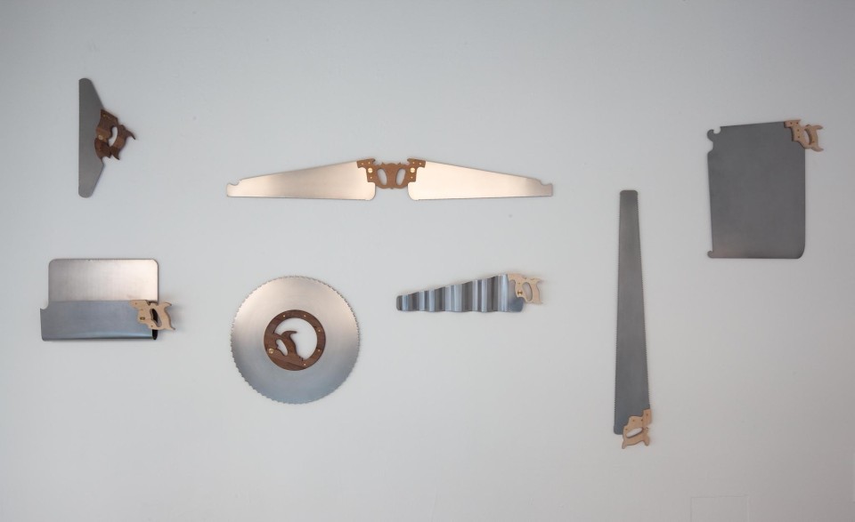 L’œuvre Scies (2021) qui ouvre l’exposition présente une multitude de détournements venant questionner la valeur technique de l’outil. Cet aspect est renforcé par le dispositif d’accrochage, lequel fait directement écho aux imposants catalogues d’outillage qui nous permettent de trouver l’outil adéquat sur la base de la fonction précise recherchée. L’intrusion de scies visuellement reconnaissables mais difficilement classifiables d’un point de vue technique altère l’objectivité recherchée par ce genre de classements, obligeant les spectateur·trice·s·x à reconsidérer leurrapport à la technicité d’objets qui échappent à toute classification sémantique.
