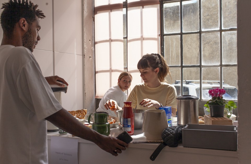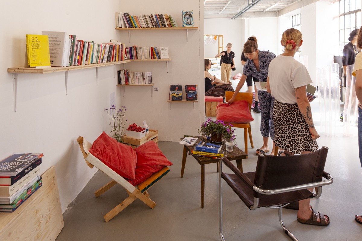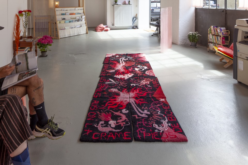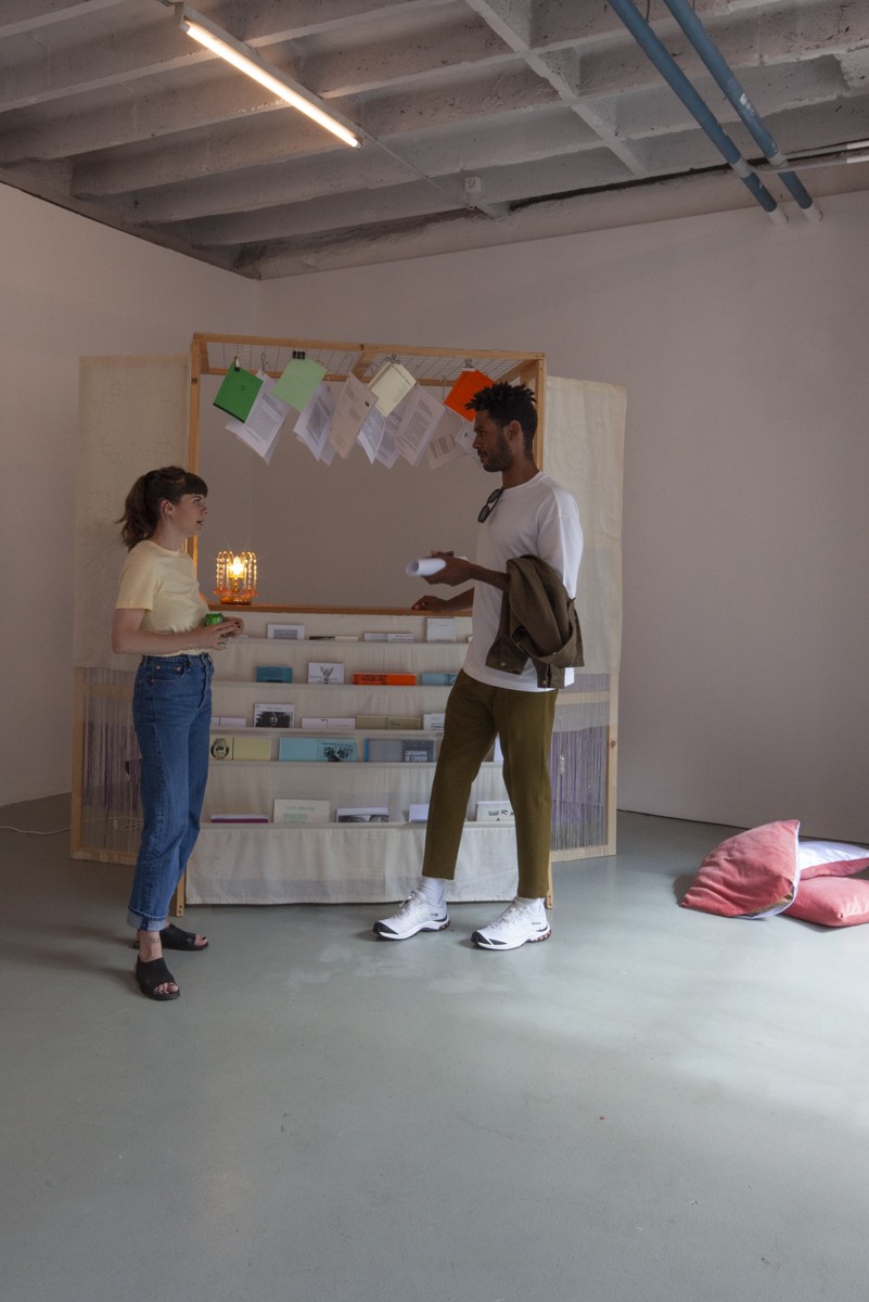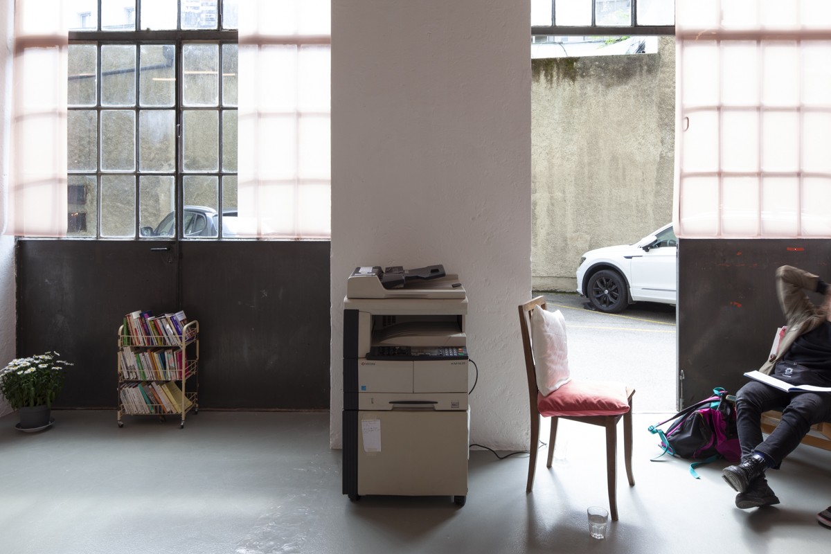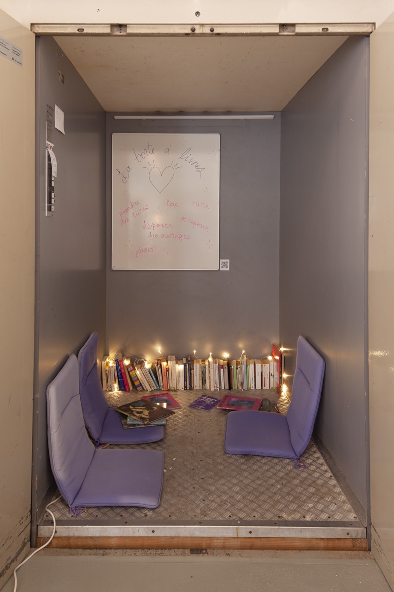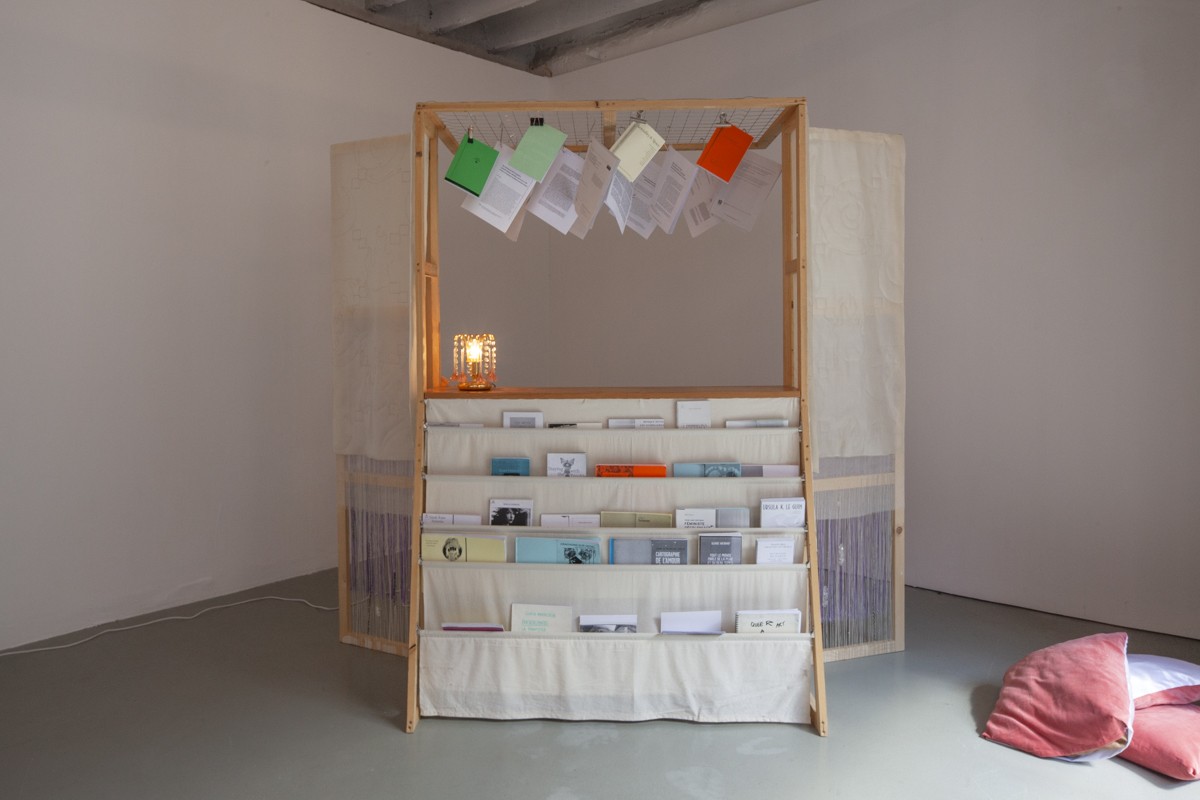 livres en libre consultation, photocopieuse, boîte à livres, infokiosque par Stéphanie Rosianu, bar et petite restauration, tapis par tapis.vnr, pièce sonore de Juliette Henrioud, échanges autour des lectures de pde