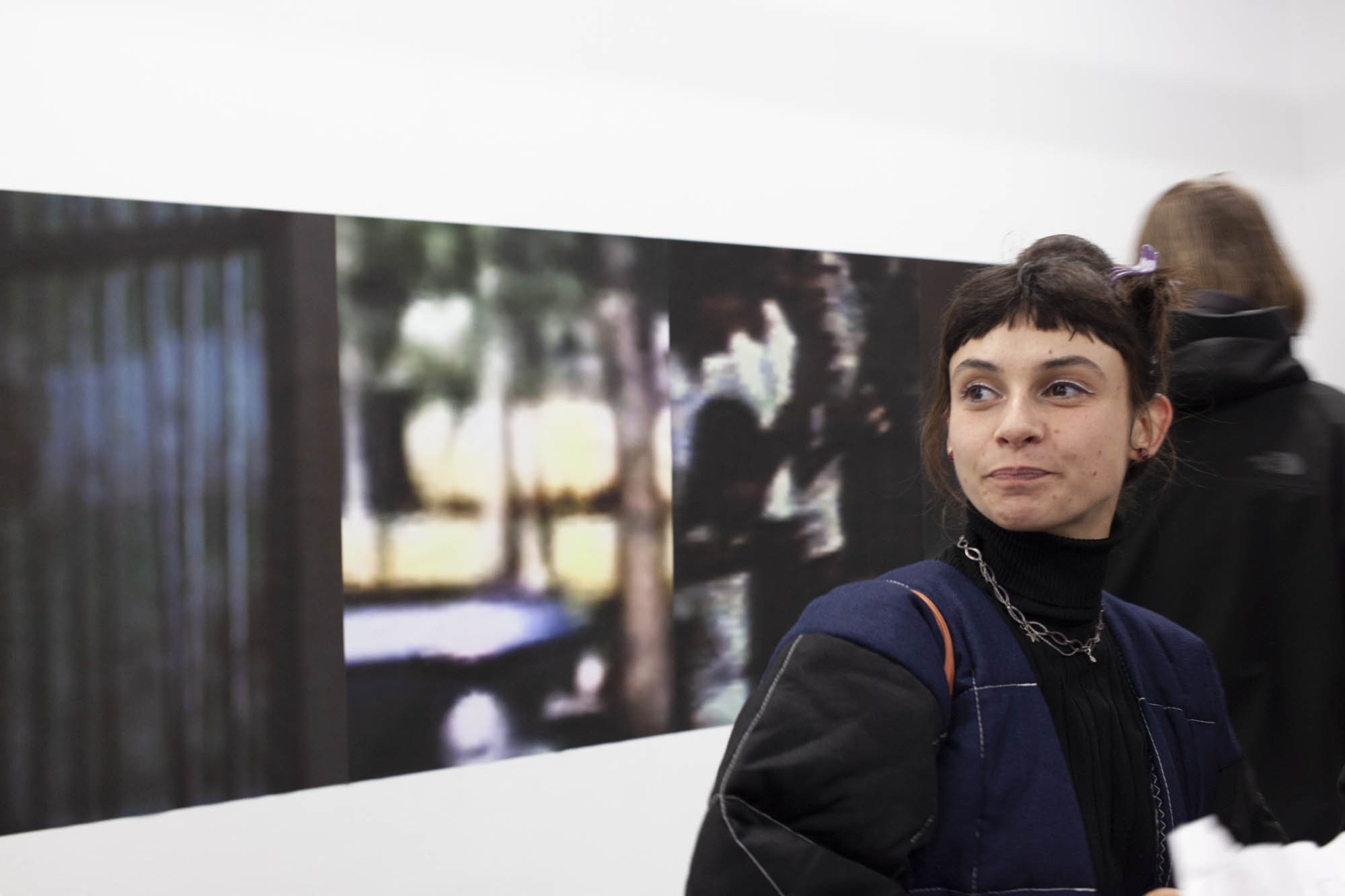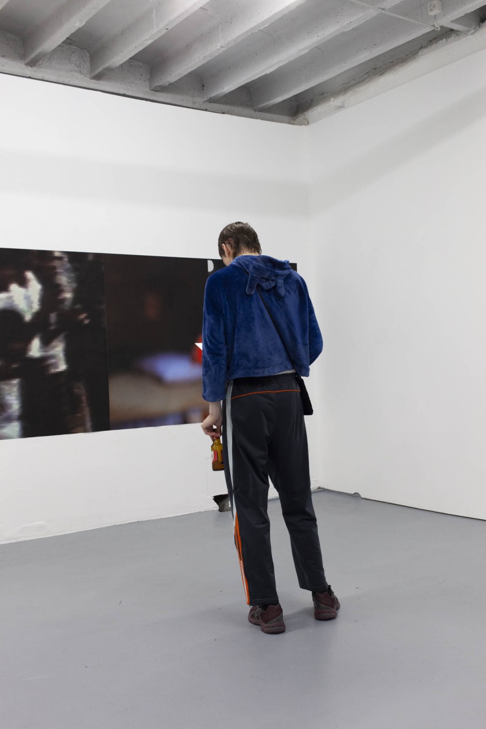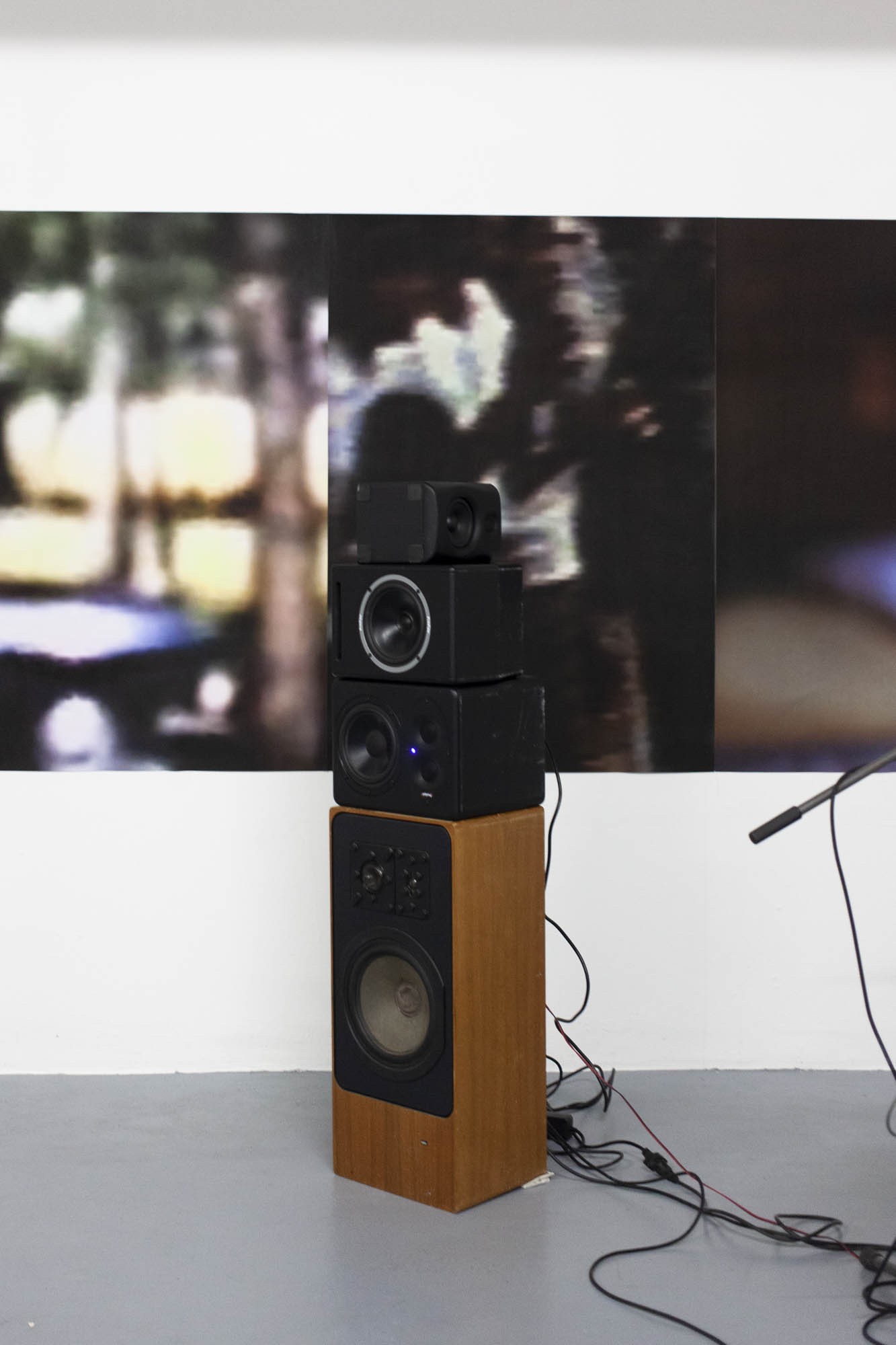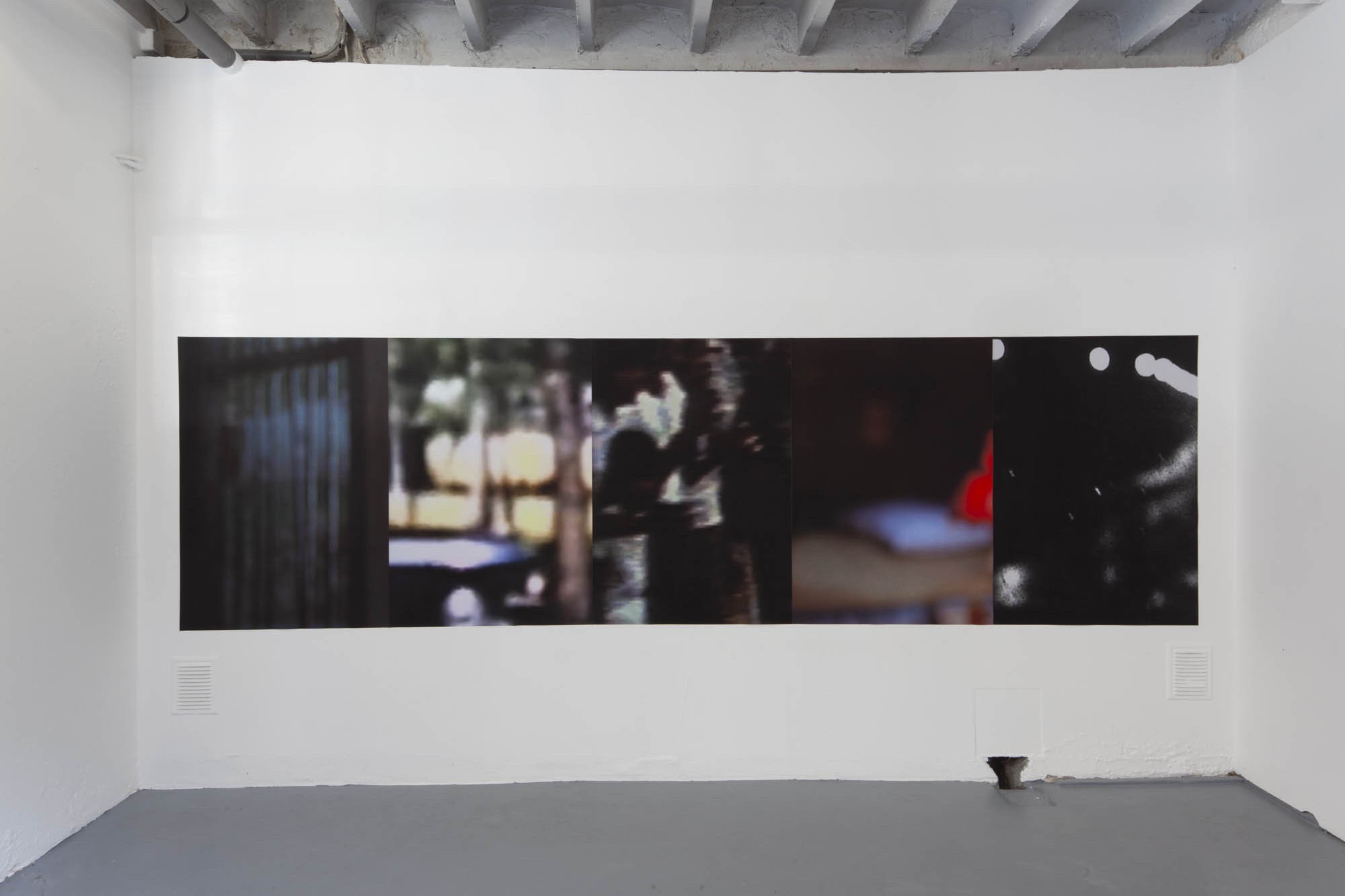 Au mur, des grandes impressions sont collées les unes aux autres. Ce sont des captures d’écrans, issues de différents films, devenus méconnaissables. Seuls les arrière-fonds des plans ont été gardé, réunissant ainsi des sources éclectiques au même niveau de lecture. Elles partagent l’esthétique du flou, permettant leur rencontre.