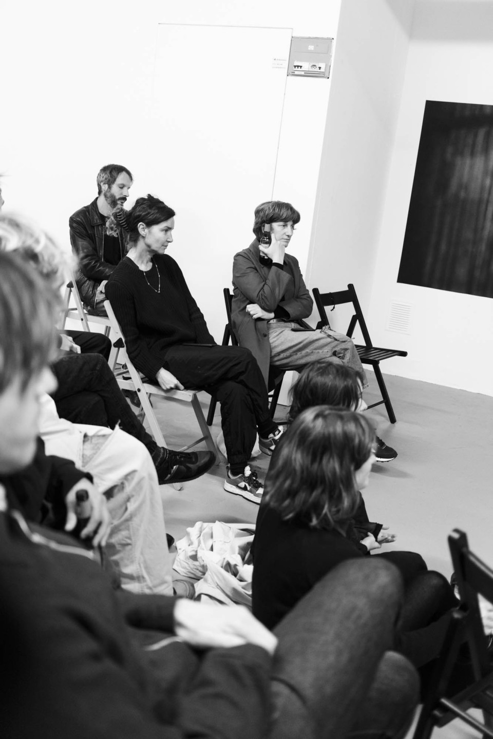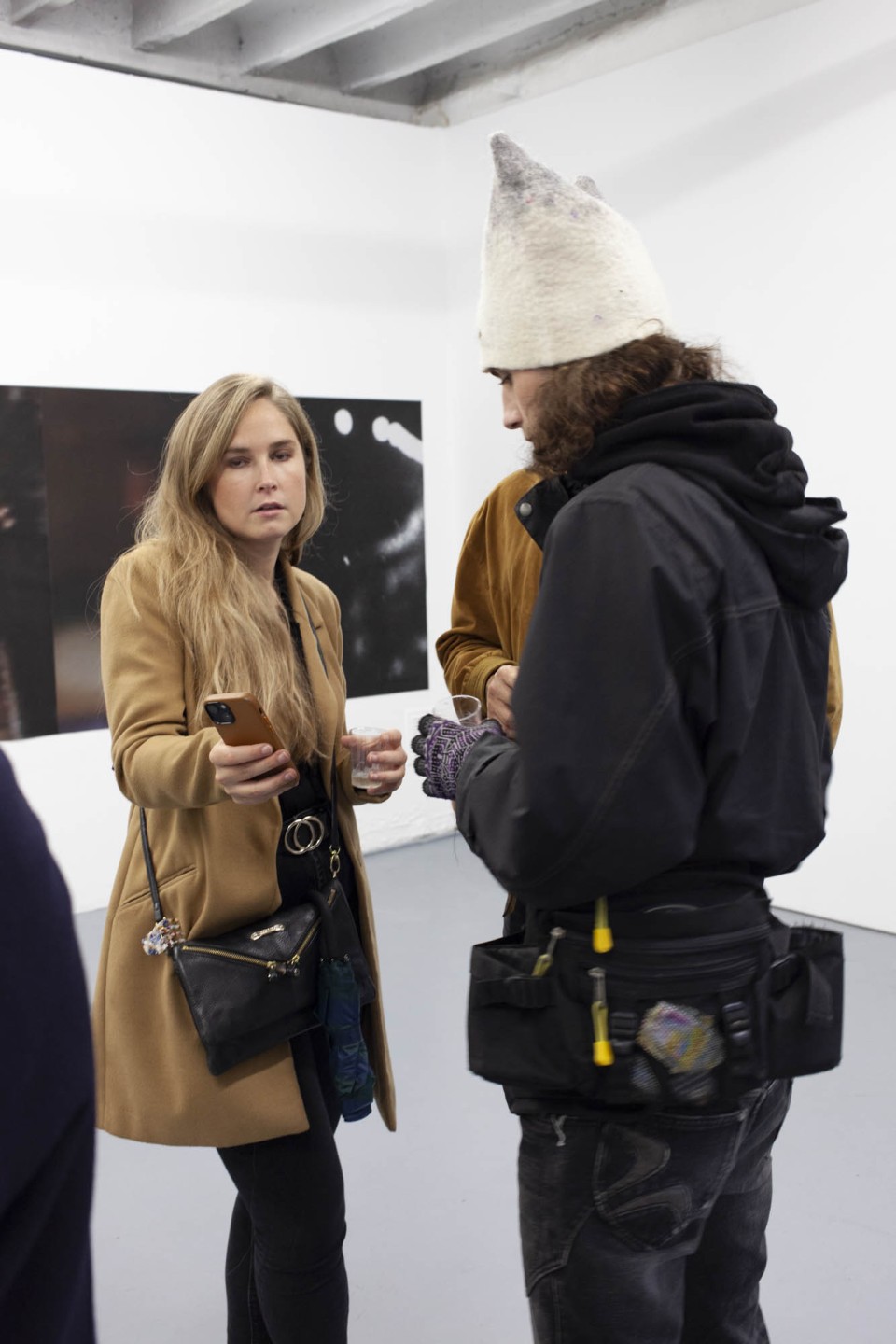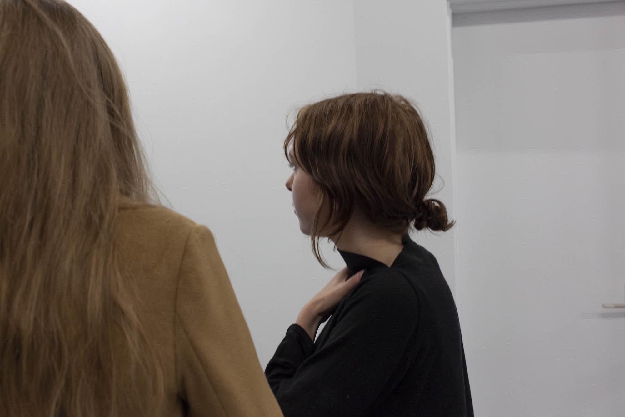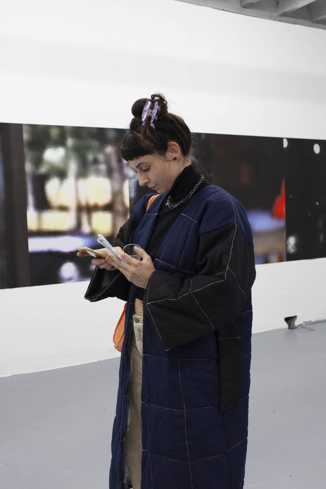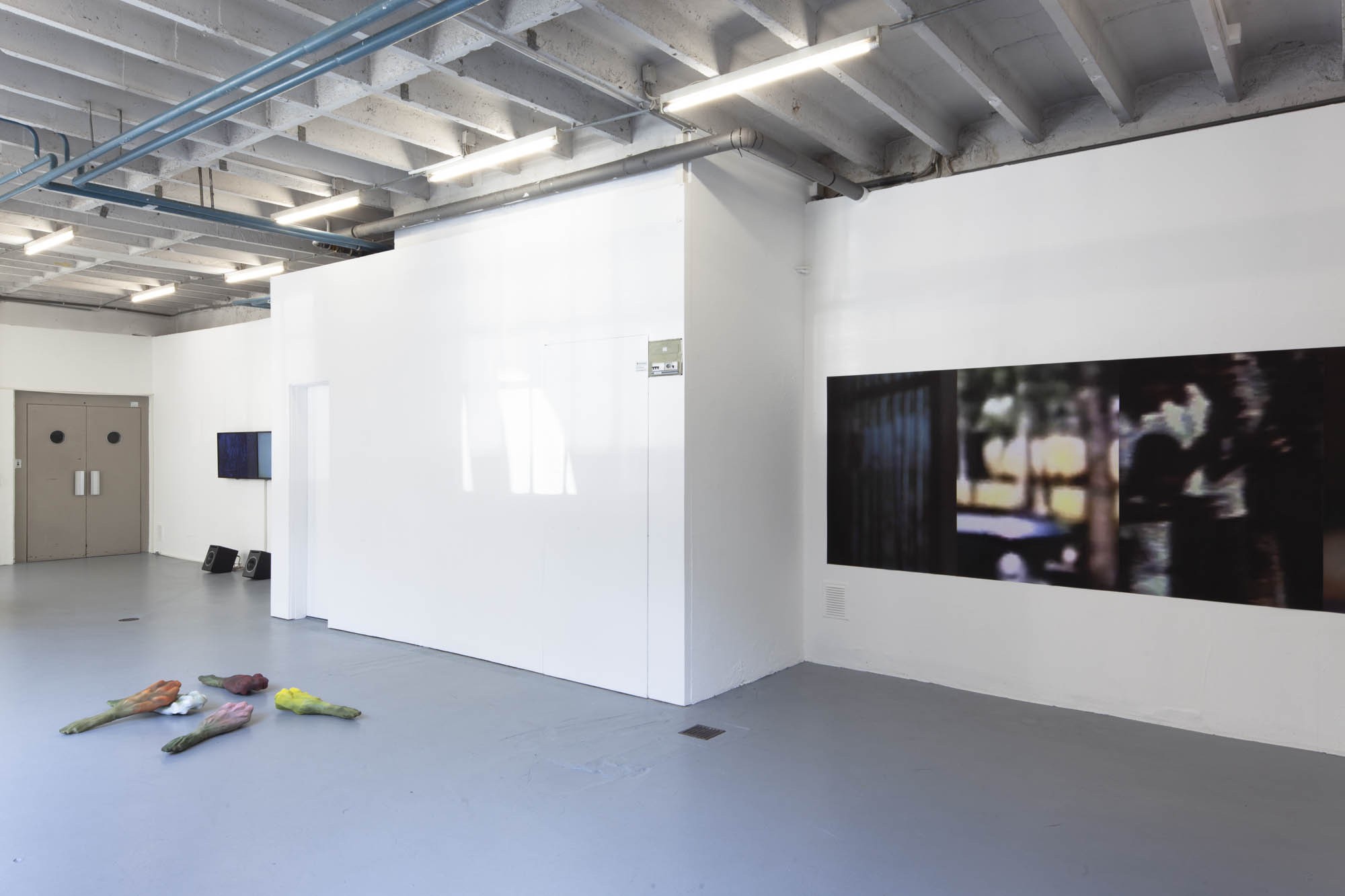 Au mur, des grandes impressions sont collées les unes aux autres. Ce sont des captures d’écrans, issues de différents films, devenus méconnaissables. Seuls les arrière-fonds des plans ont été gardé, réunissant ainsi des sources éclectiques au même niveau de lecture. Elles partagent l’esthétique du flou, permettant leur rencontre.