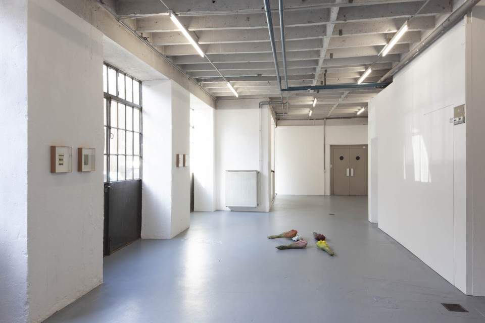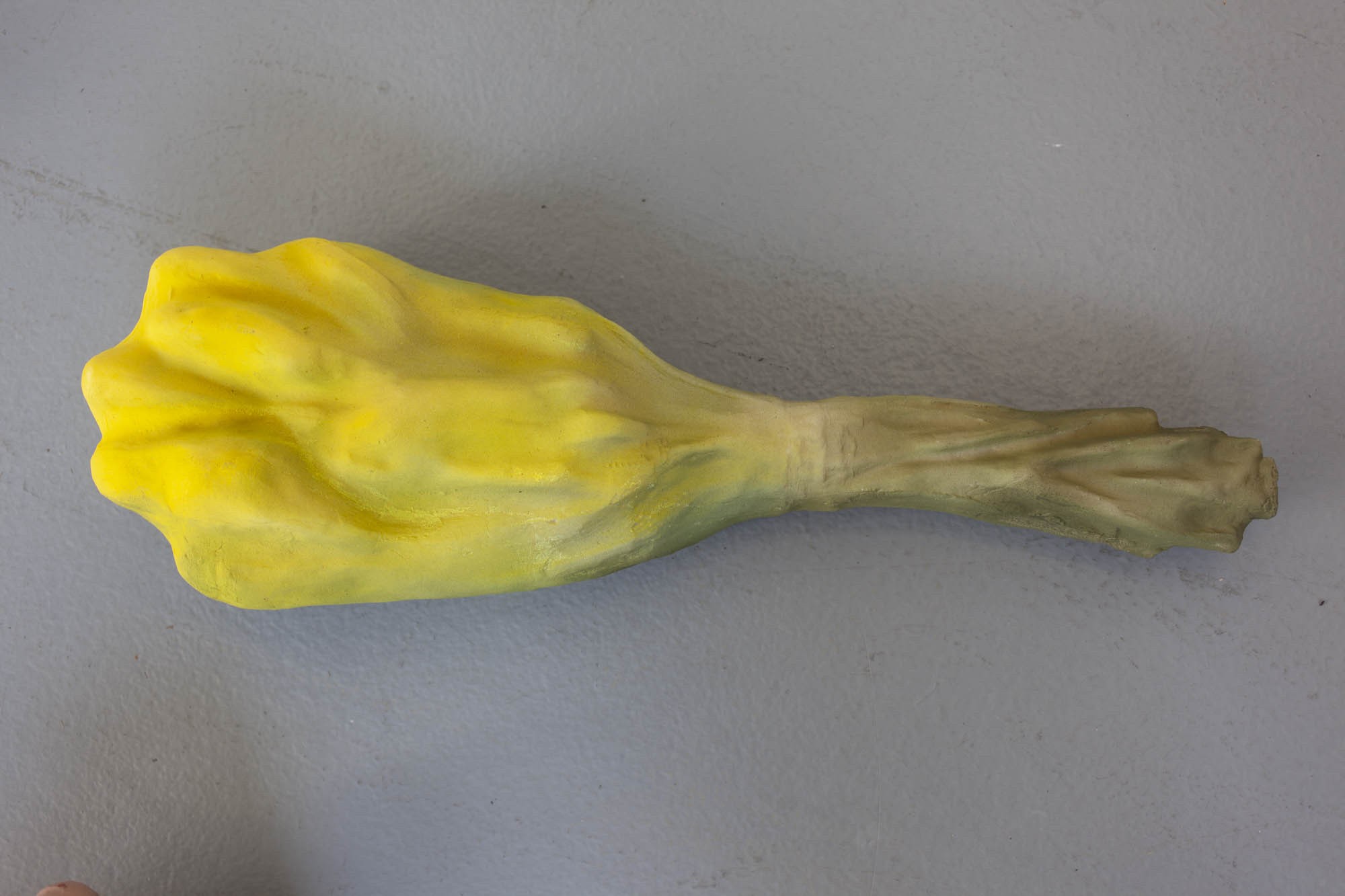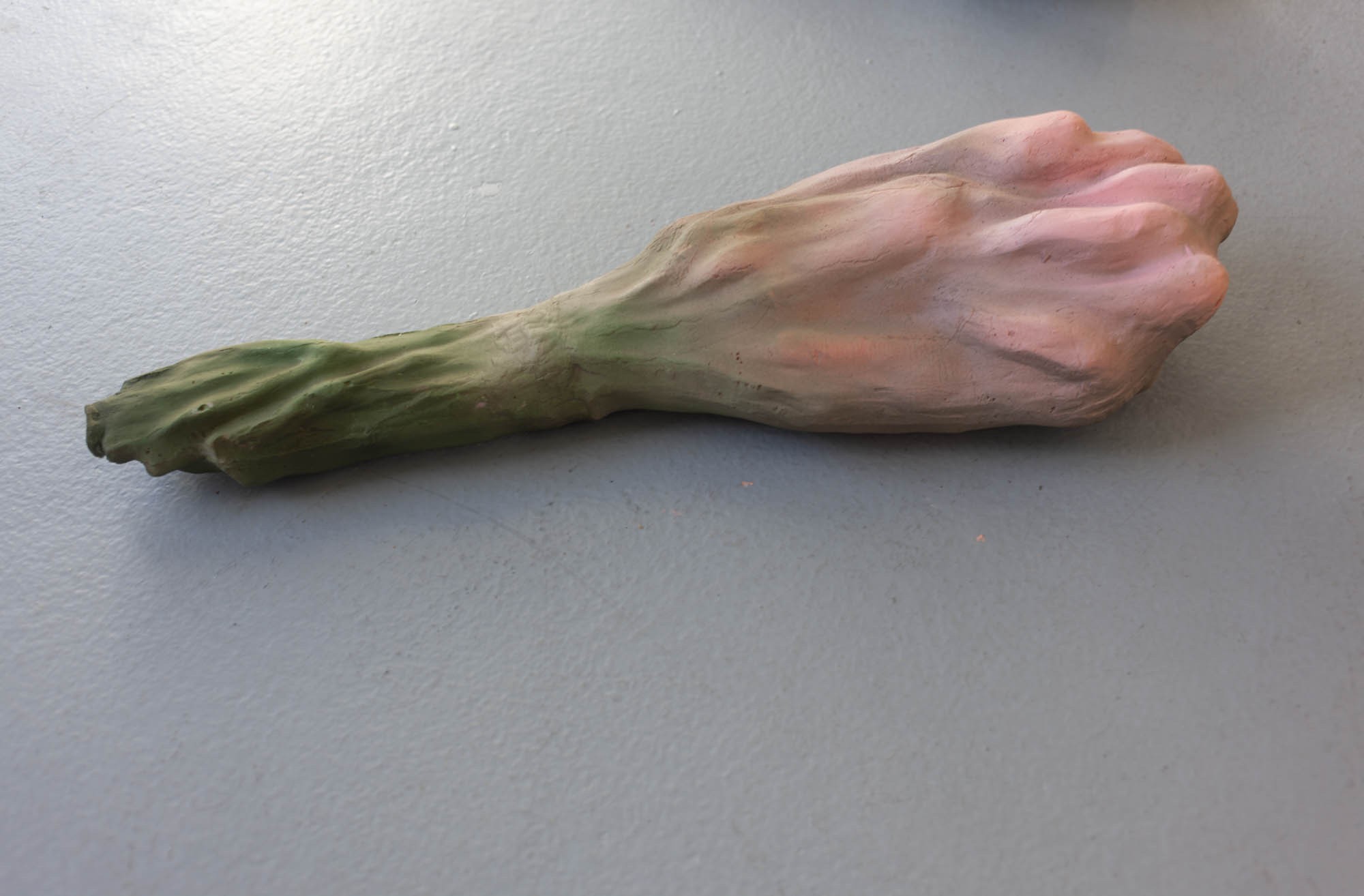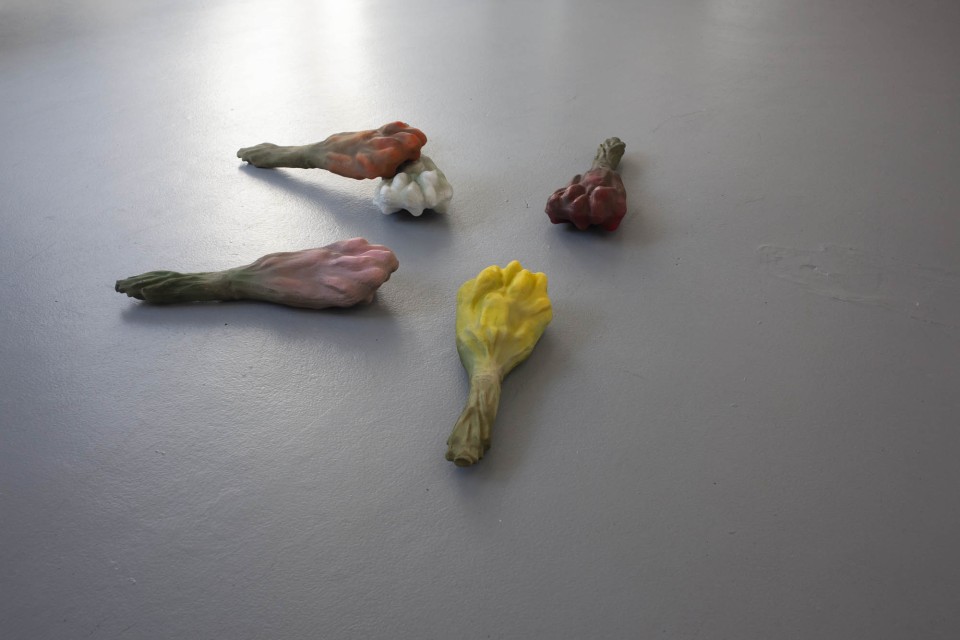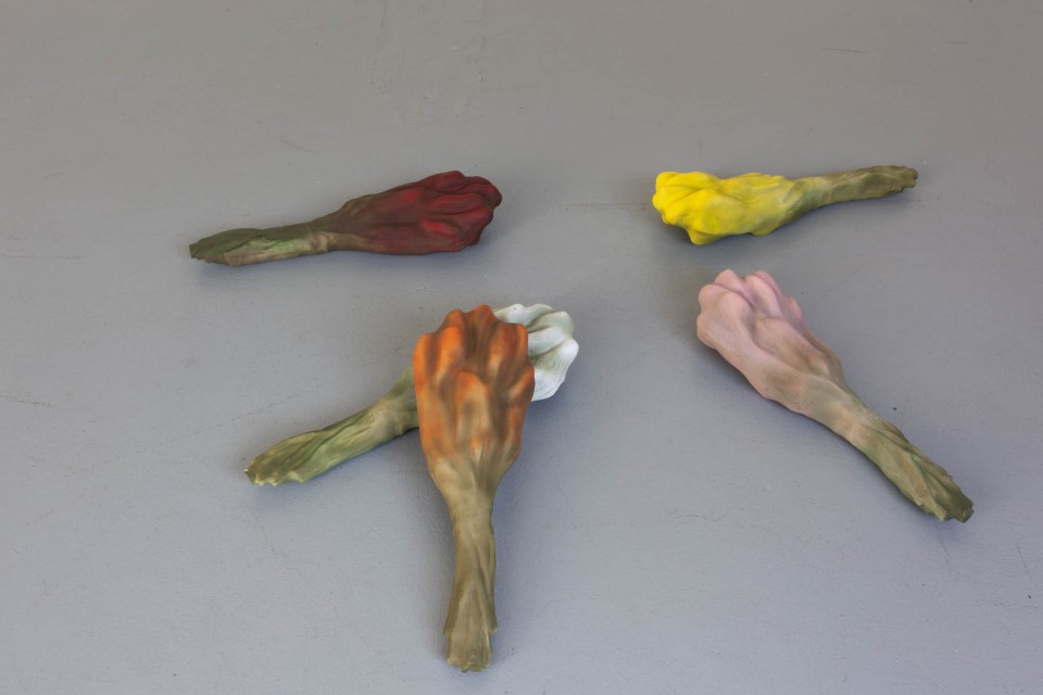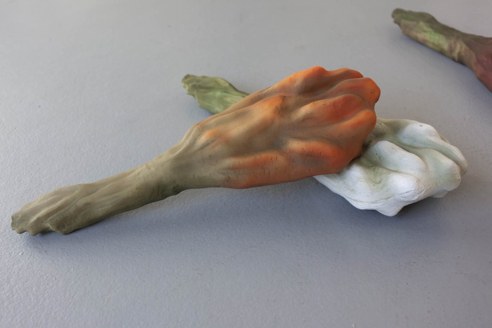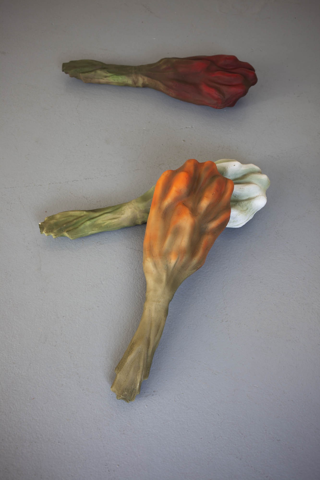 Les sculptures de cire ont quant à elles, été fabriquées selon la méthode dite hyperréalistes des musées de cire. Cette technique consiste à reconstituer un modèle photographié en volume, en le coulant en cire et en le peignant ensuite. Ici ce processus est respecté mais la photographie était celle d’un bouquet de tulipes flou, ce choix brouille la fabrication. La forme finale est ambigüe et déformée.