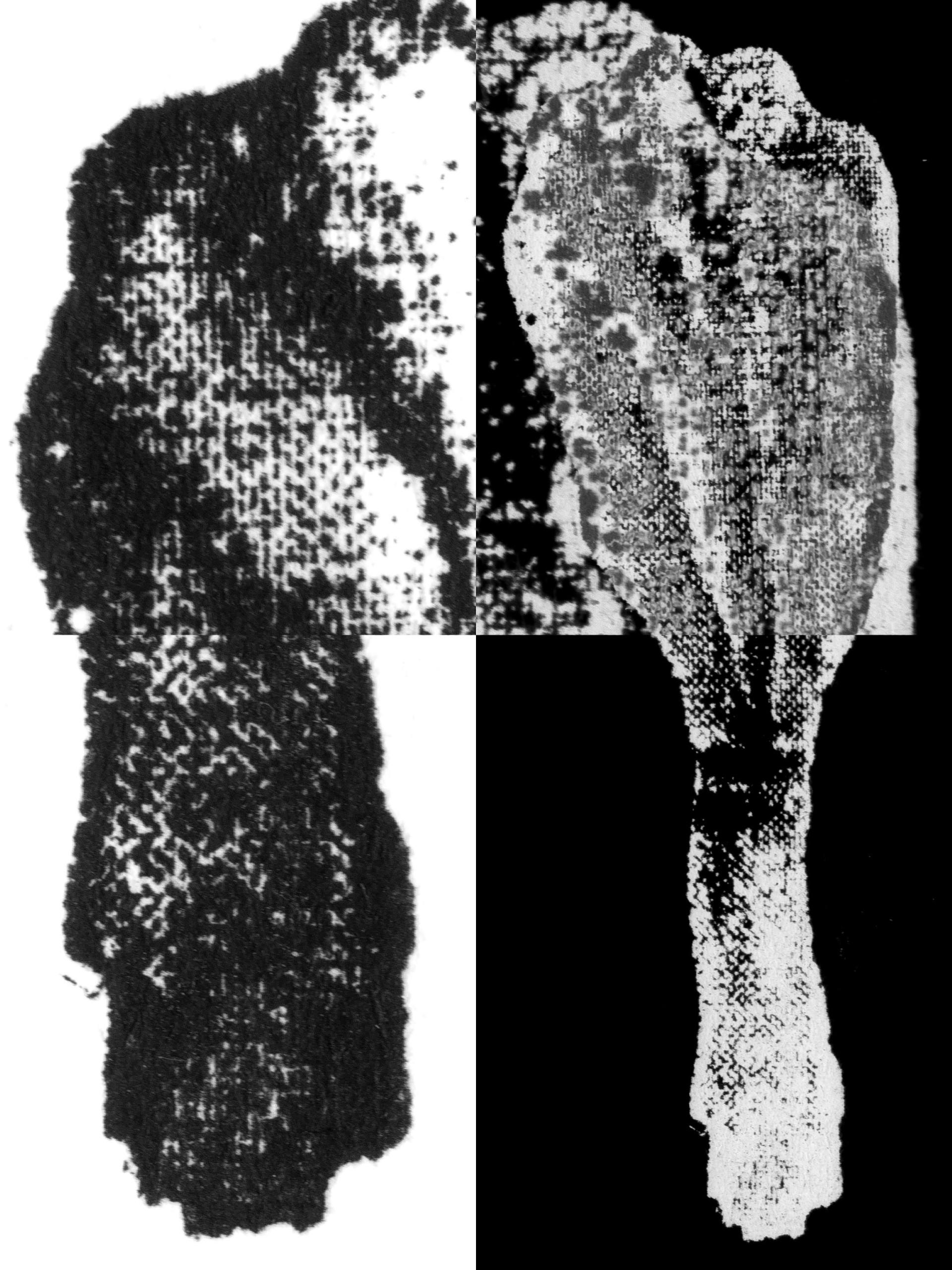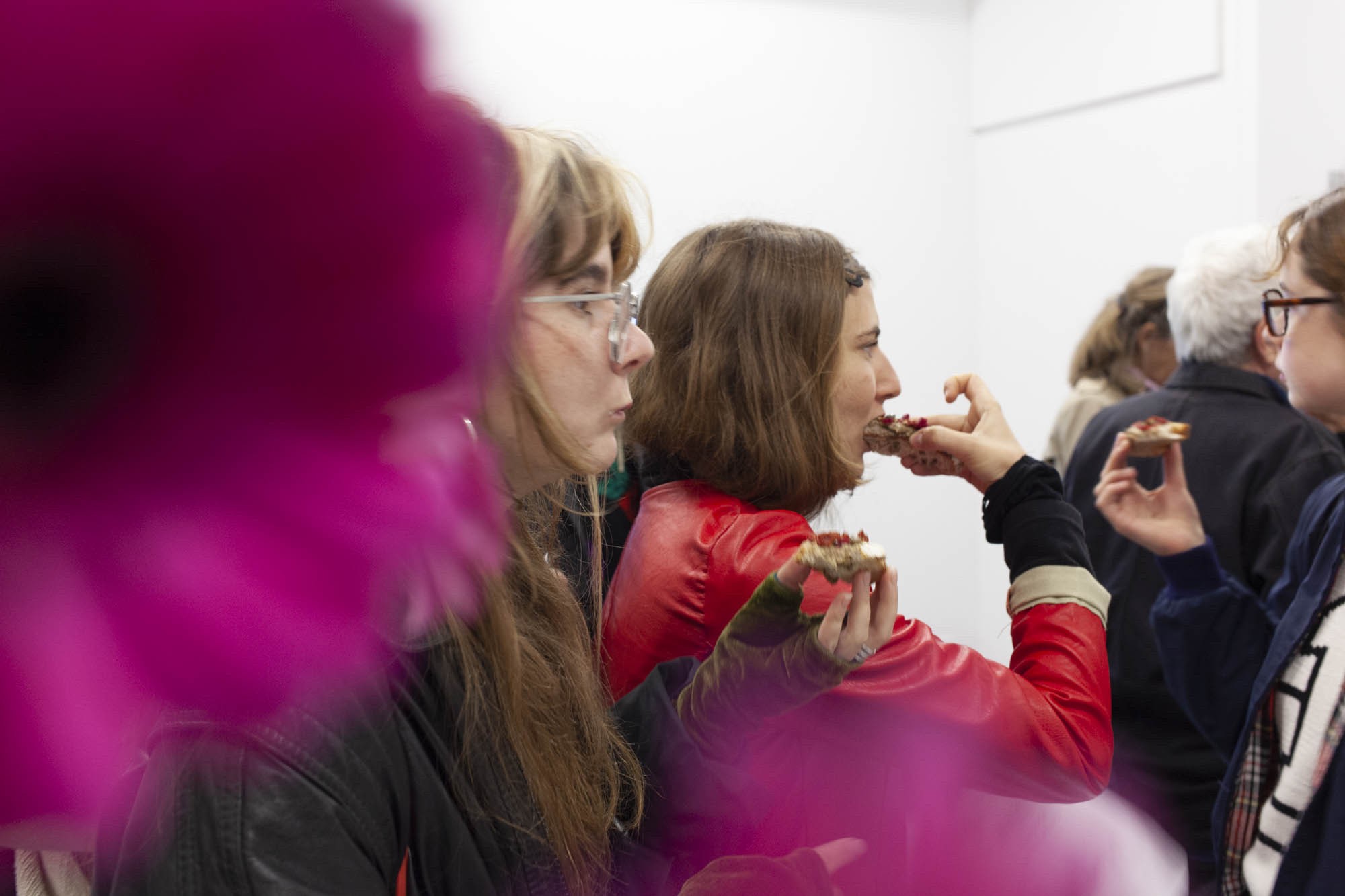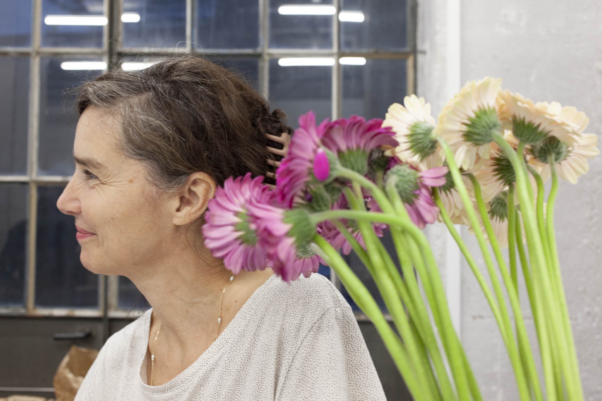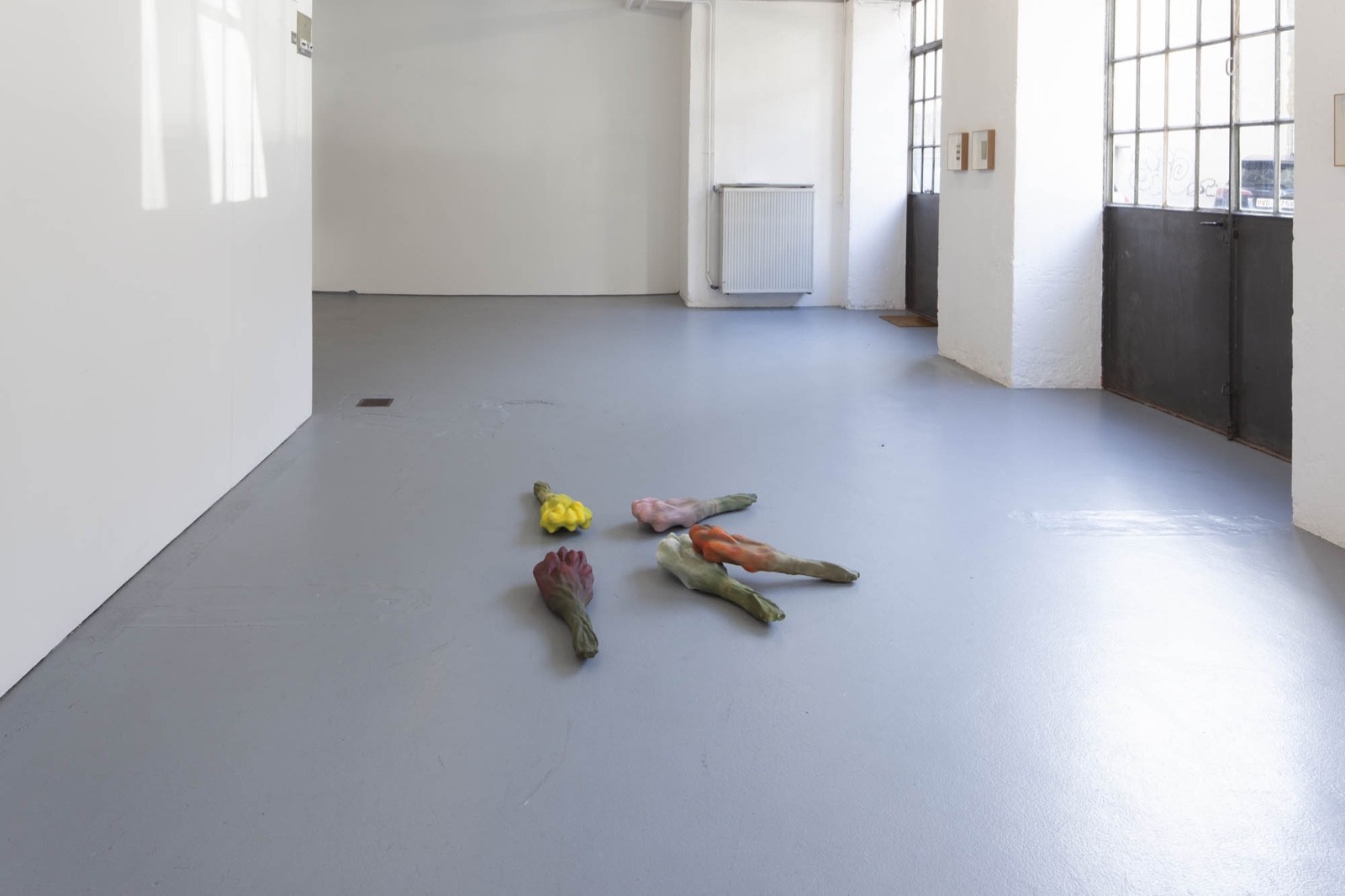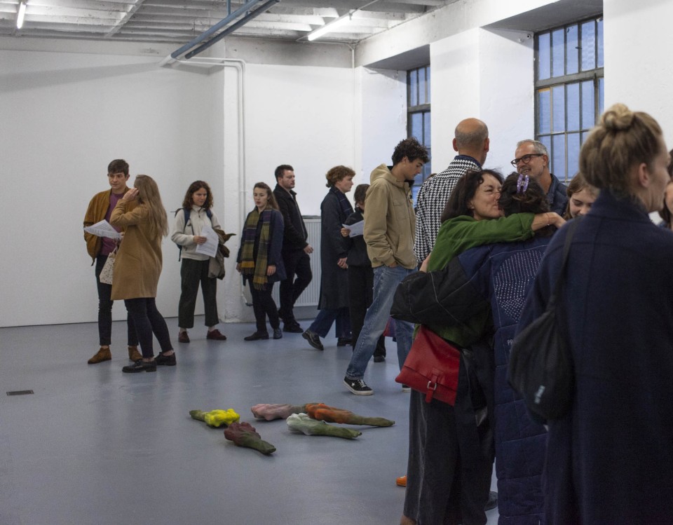 Les sculptures de cire ont quant à elles, été fabriquées selon la méthode dite hyperréalistes des musées de cire. Cette technique consiste à reconstituer un modèle photographié en volume, en le coulant en cire et en le peignant ensuite. Ici ce processus est respecté mais la photographie était celle d’un bouquet de tulipes flou, ce choix brouille la fabrication. La forme finale est ambigüe et déformée.