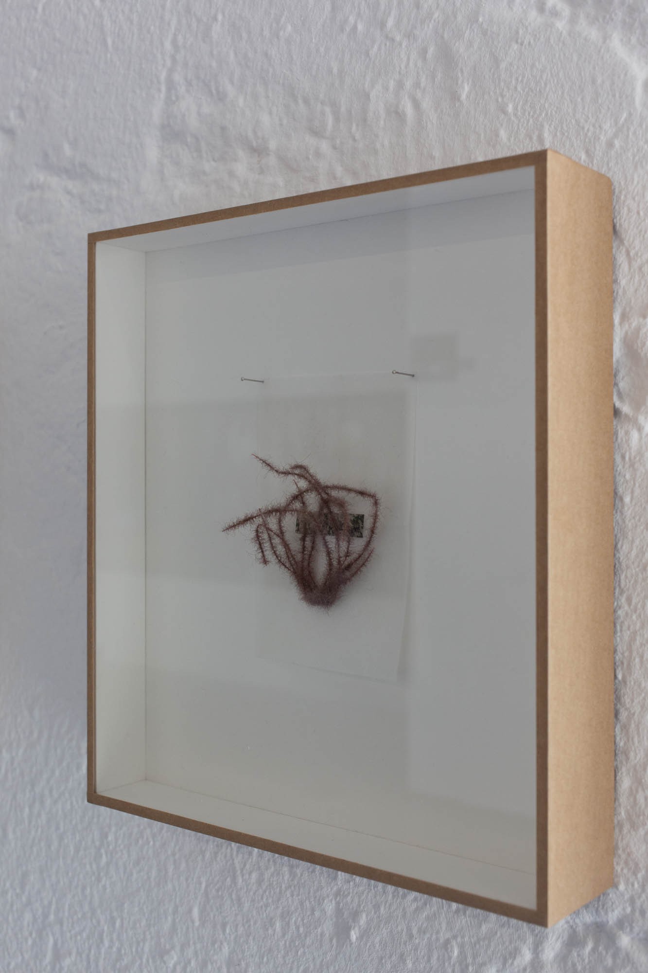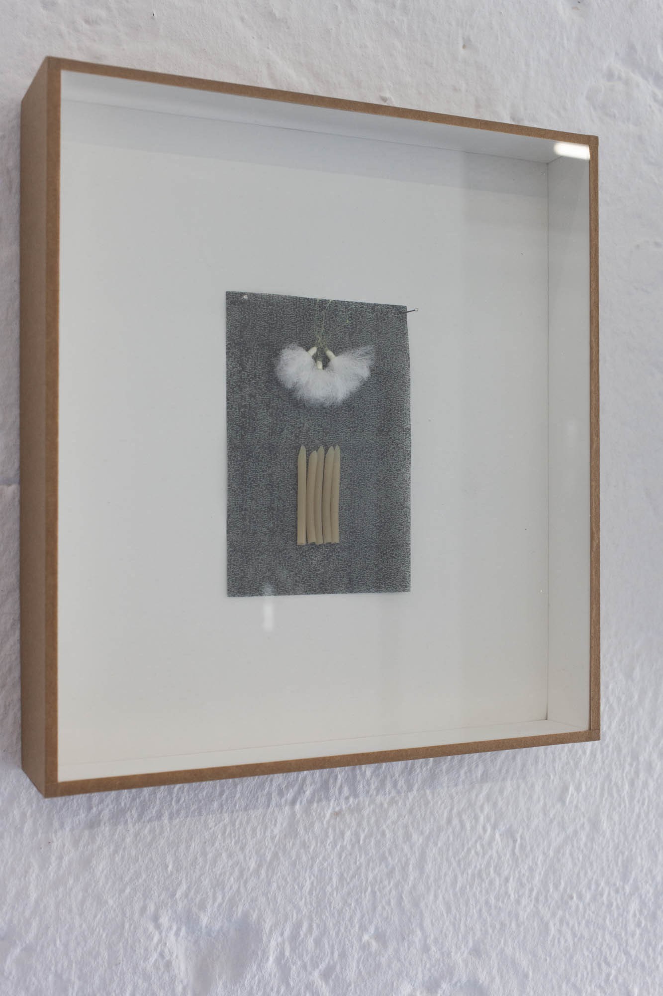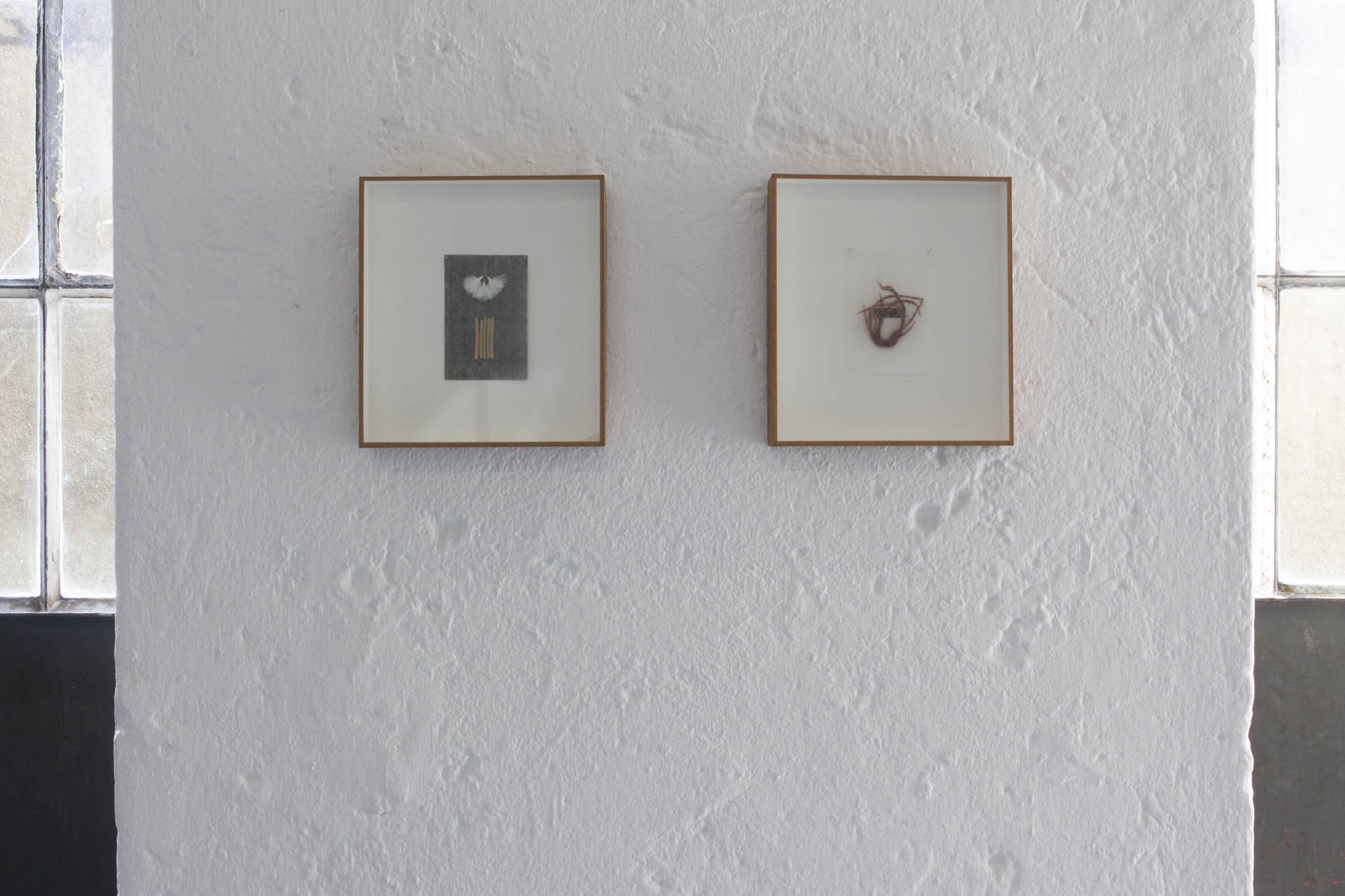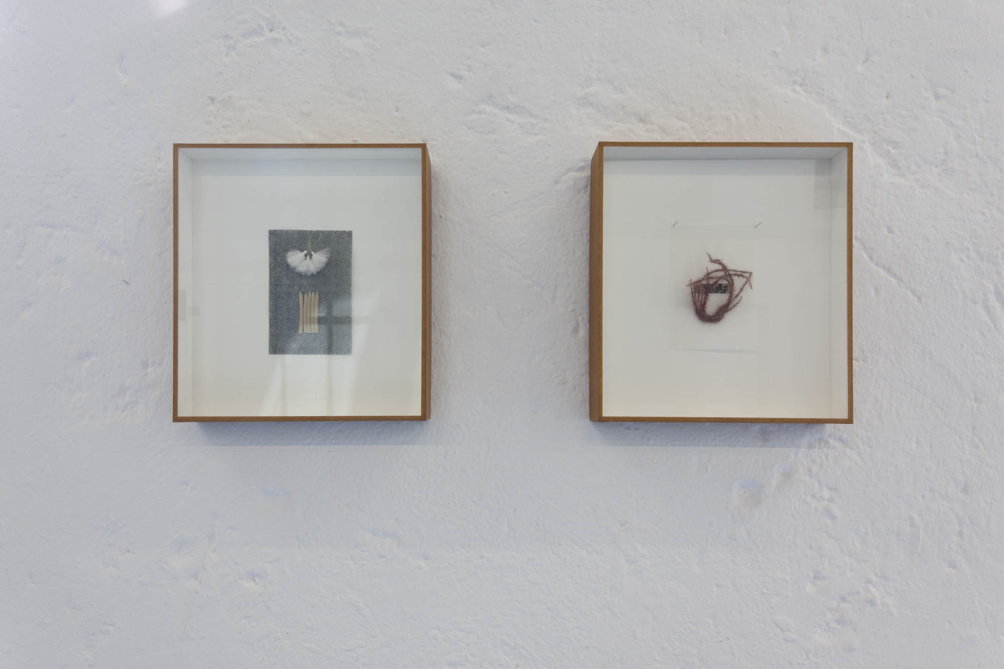 Les dernières pièces sont de petits collages enfermés dans des boites, comme une collection d’entomologiste. Ils sont conçus à partir des matériaux qui servent à la fabrication des mouches de pêche. L’artiste n’a transformé aucun de ces éléments fait pour la simulation et au contraire les a réutilisés pour composer des abstractions.