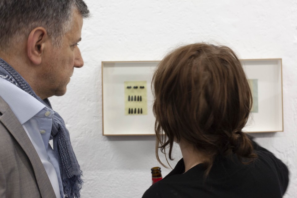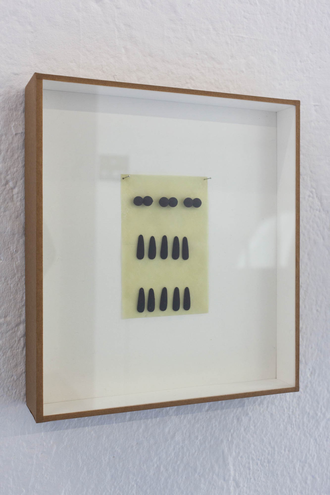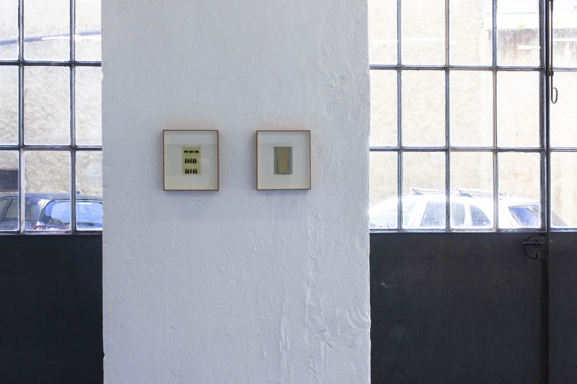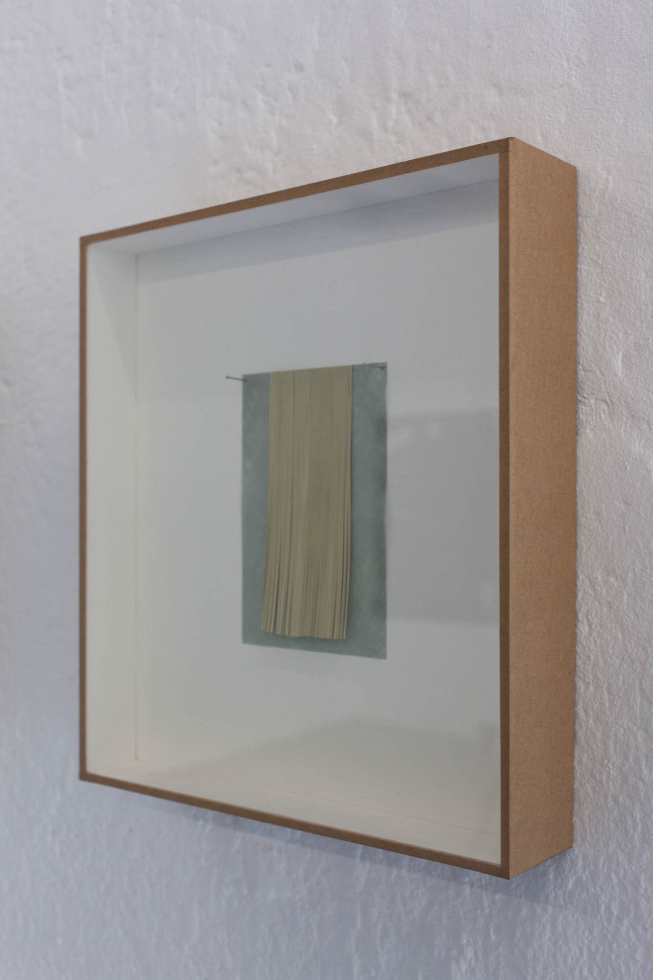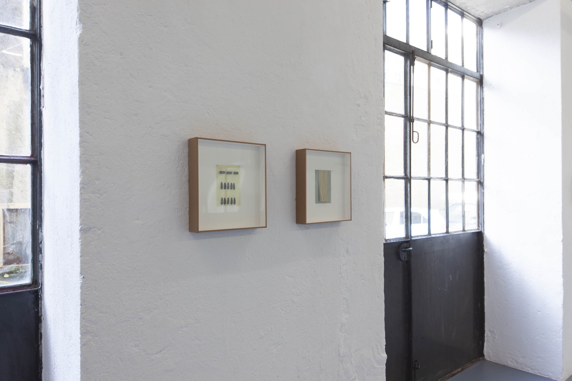 Les dernières pièces sont de petits collages enfermés dans des boites, comme une collection d’entomologiste. Ils sont conçus à partir des matériaux qui servent à la fabrication des mouches de pêche. L’artiste n’a transformé aucun de ces éléments fait pour la simulation et au contraire les a réutilisés pour composer des abstractions.