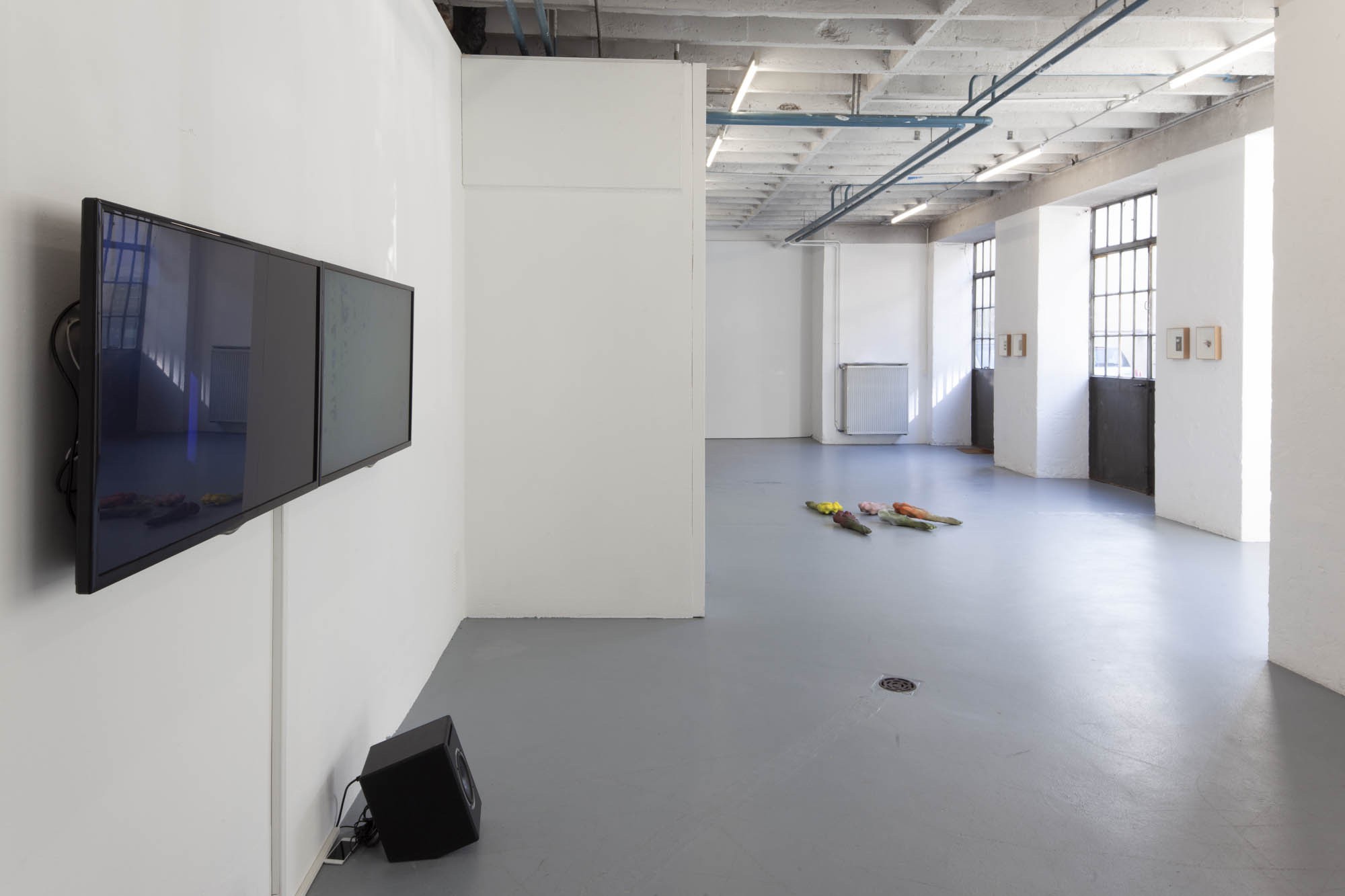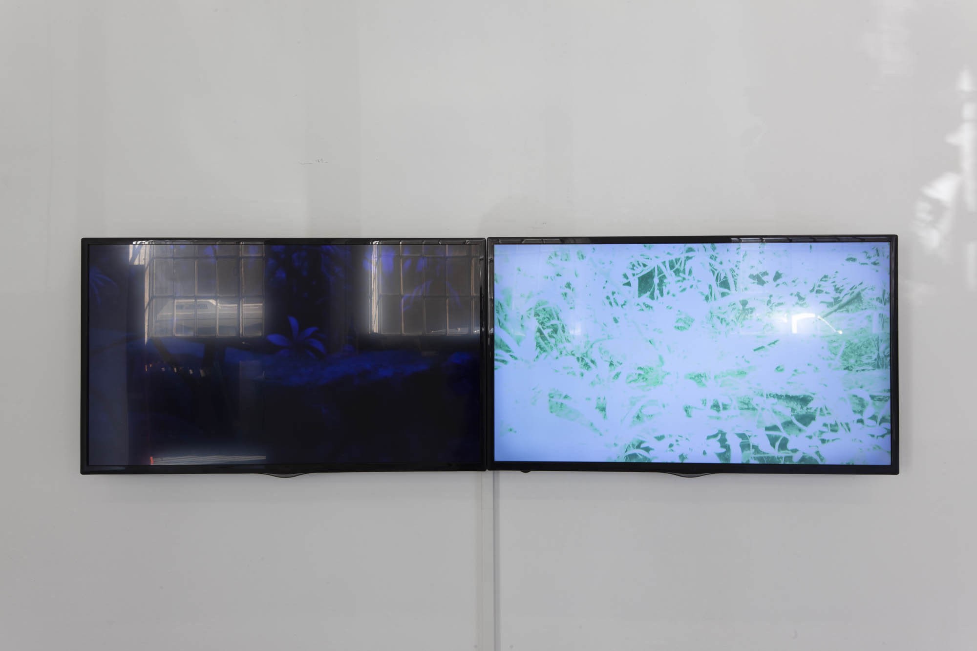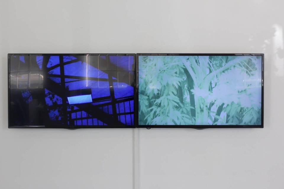 Sur double écran, les vidéos montrent deux parties d’un même endroit, le Papilliorama, filmées quasi simultanément. Ce parc, situé dans la campagne suisse, recompose des environnements tropicaux. Y sont dévoilés d’un côté des milliers de papillons et de l’autre des espèces nocturnes plongées dans une nuit artificielle, crée à l’aide de filtres bleu et de lampes de la même couleur. L’artiste filme cette inversion jour/nuit en jouant avec le pouvoir de la caméra, elle-même capable de rendre visible la nuit. Dans ces vidéos le mode nightshift est utilisé en plein jour, saturant l’image. Les papillons volent dans ce décor incandescent. Sur l’autre écran, les dispositifs techniques sont observés, la fabrication d’une nuit dévoilée.
