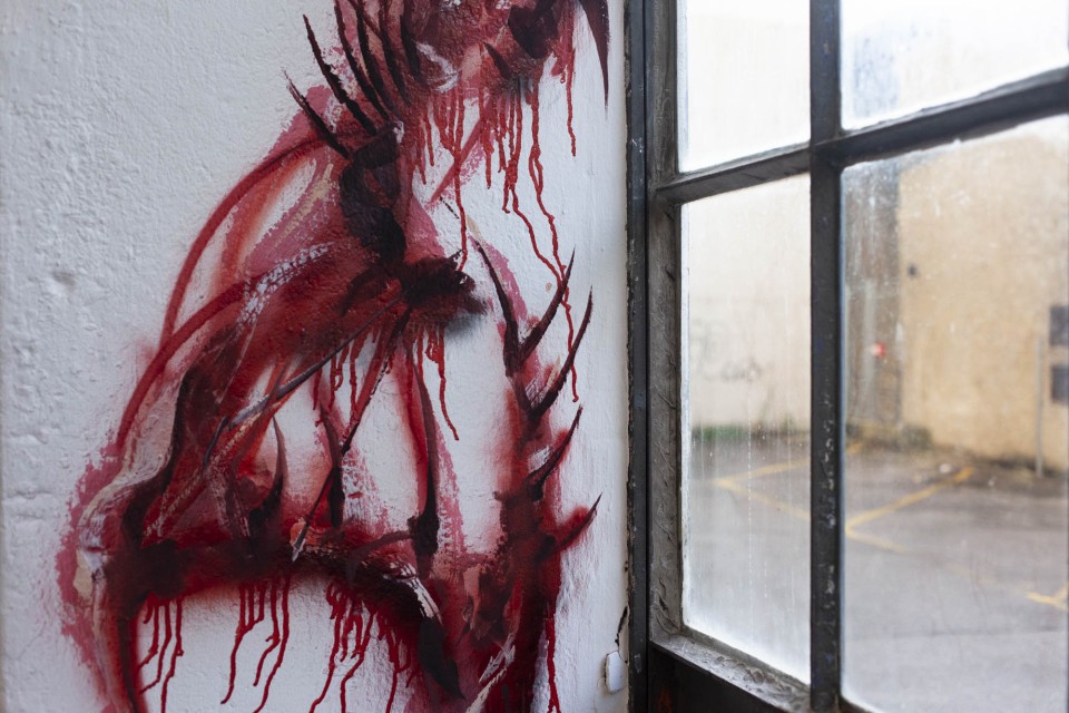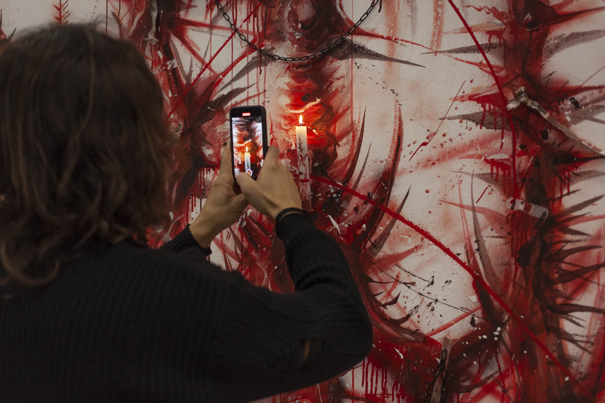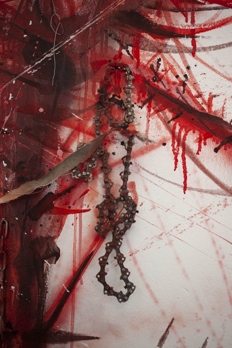 Sabrina Biro et ᛟᛞᛁᚾᛟ ont réalisé spécialement pour cette exposition une série de photographies, des sculptures et des peintures murales. Brutales et à la fois séduisantes, les oeuvres de ces deux artistes interrogent la fascination que nous pouvons entretenir avec la mort et ses représentations. Les vanités dépeintes dans l’histoire de l’art occidentales, à savoir des images représentants des ossements ou tout objets ayant un lien direct avec la mort, possédaient différentes significations mais convergeaient sur la même idée. Peu importe notre classe sociale, savoir, identité ou richesses, nous finirons tous·x·tes en poussière. Notre relation à la mort s’est développée ces dernières décennies avec le cinéma et les séries. D’une réflexion philosophique, notre oeil s’est orienté vers un attrait pour l’organique, le sensationnel. Sabrina Biro et ᛟᛞᛁᚾᛟ illustrent ce glissement sémantique et esthétique chacun·e à leur manière. Du Memento mori au gore, At the heart of it all propose au public une expérience sensorielle.