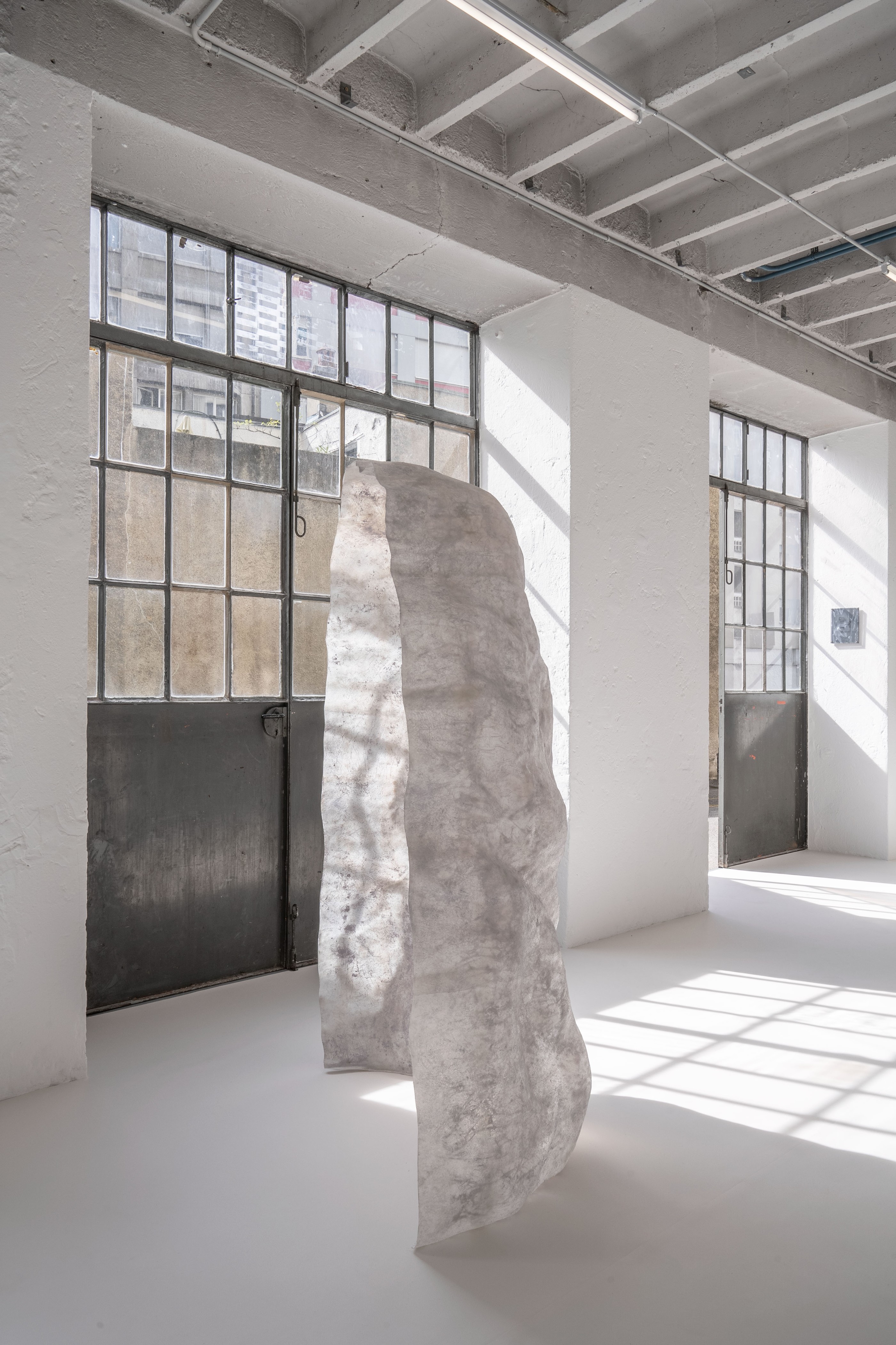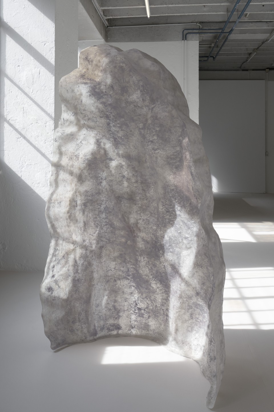 Avec Entre-deux, Pauline Cordier ne déroge pas à ses propres règles. Elle raconte le lien au lieu. L’artiste prend comme point de départ l’histoire de Lausanne, où pierre tendre et cours d’eau en ont dessiné la topographie, et l’architecture de l’espace d’exposition. Il dissimule la roche de la ville et abrite une rivière. Standard/deluxe s’insère entre creux et collines, entretenant une relation secrète aux éléments naturels qui l’entourent. Pour révéler cette relation intime, pour donner à voir des formes invisibles et témoigner de fonctions caduques, l’artiste met en place un dévoilement progressif. Avec des grilles d’aération jaune fluo tout d’abord. En les disséminant sur les murs, Pauline Cordier reproduit et dédouble celles déjà présentes, qui permettent à la roche de respirer. Et avec un couvercle de regard argenté. Moulé sur celui existant et déposé à la surface d’un nouveau sol blanc recréé par l’artiste, il suggère l’écoulement de l’eau et évoque une présence passée. On se souviendrait alors presque que la matière est vivante et mouvante. Puis enfin, avec une frontalité certaine, l’artiste dépose au centre de l’espace trois formes translucides. Nos corps sont confrontés à ces objets qui, en imitant la matérialité de la roche, nous donnent à voir ce que l’on n’a jamais su qui existait. Ou que l’on a simplement oublié et laissé derrière. L’aspect des sculptures, recouvertes de pigments photochromiques, évolue à chaque instant: la lumière qui pénètre par la baie vitrée les fait osciller du gris clair au gris sombre. Le soleil les transforme mais les vide de leurs propriétés physiques : plus le temps défile, plus les pigments meurent.