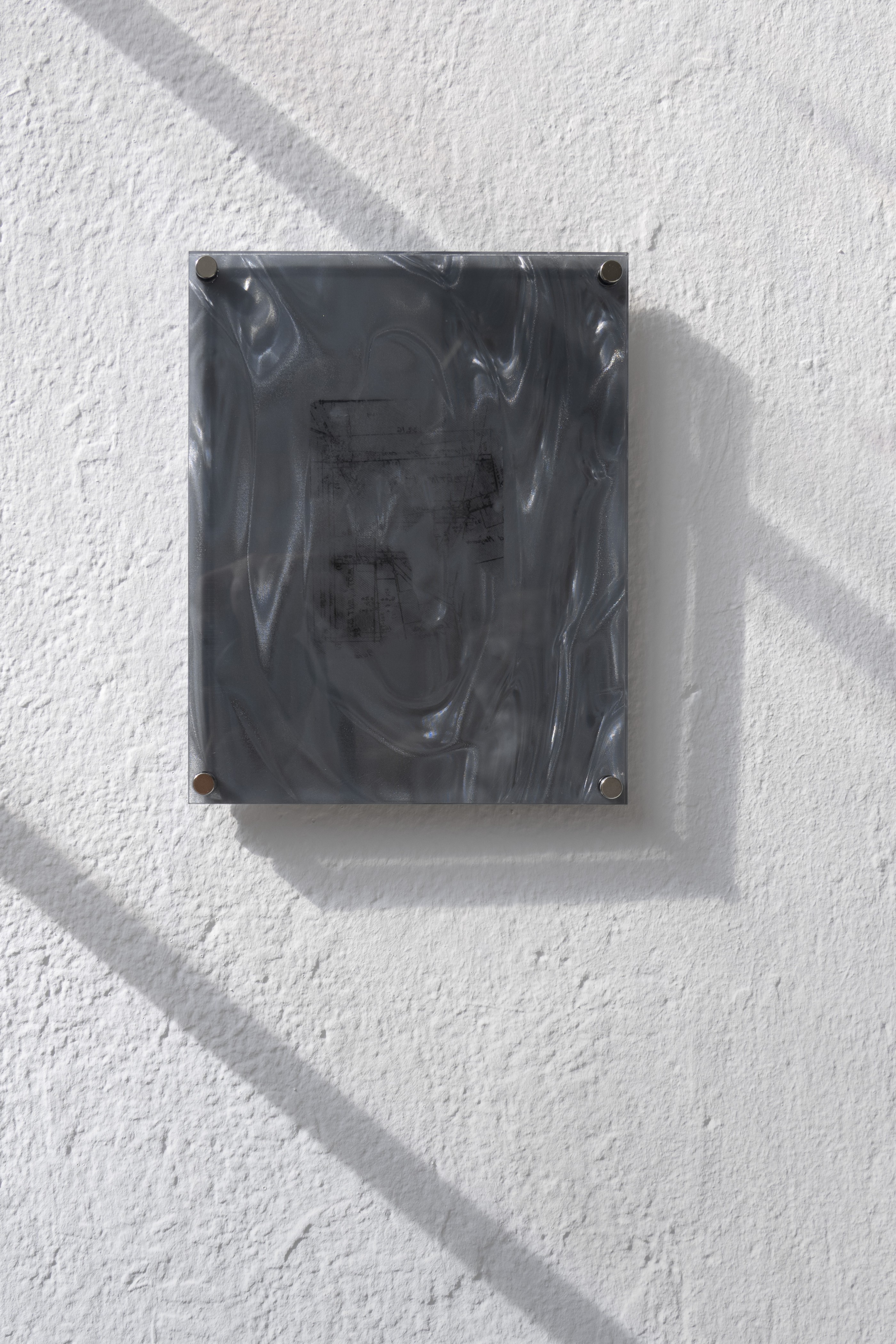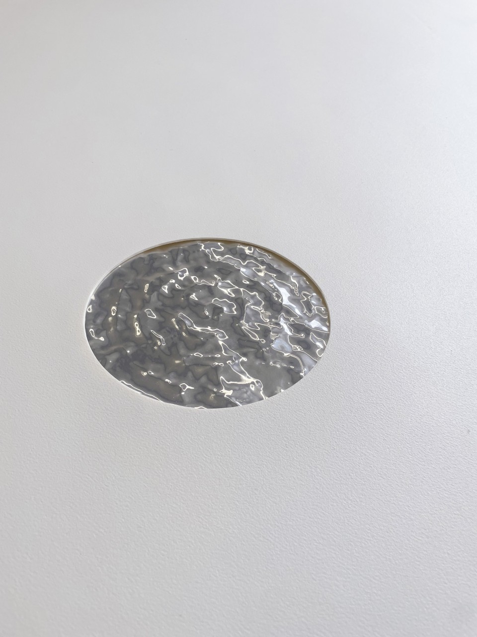 Une goutte d’eau qui s’échappe d’une verrière fissurée et remplit le bassin au sol (Flot-fuyant, Salle Crosnier, Genève, 2019), un rideau de perles bétonnées qui doit être franchi comme aux entrées des maisons (Tamis misat, Galerie A.Romy, Genève, 2021), du sel qui se cristallise sur la toile (Copie non conforme, Circuit, Lausanne, 2021), des pigments photochromiques qui changent de couleur avec la lumière (Blurring time, Kunstkaten, Winterthour, 2023) ou des miroirs en inox martelé qui reflètent les arbres environnants (Variations, œuvre dans l’espace public, Lancy, 2023). Chaque œuvre de Pauline Cordier est pensée pour s’inscrire et s’immiscer, jusque dans leurs plus petits détails, dans le lieu qui les abrite. Elles pointent du doigt détails architecturaux, fonctions ou histoires. Elles leur font écho ou les prolongent. Mais elles soulèvent aussi des interrogations. Que se passe-t-il quand le temps défile? Quelles formes les temporalités peuvent-elles prendre? Comment donner corps aux choses dissimulées?