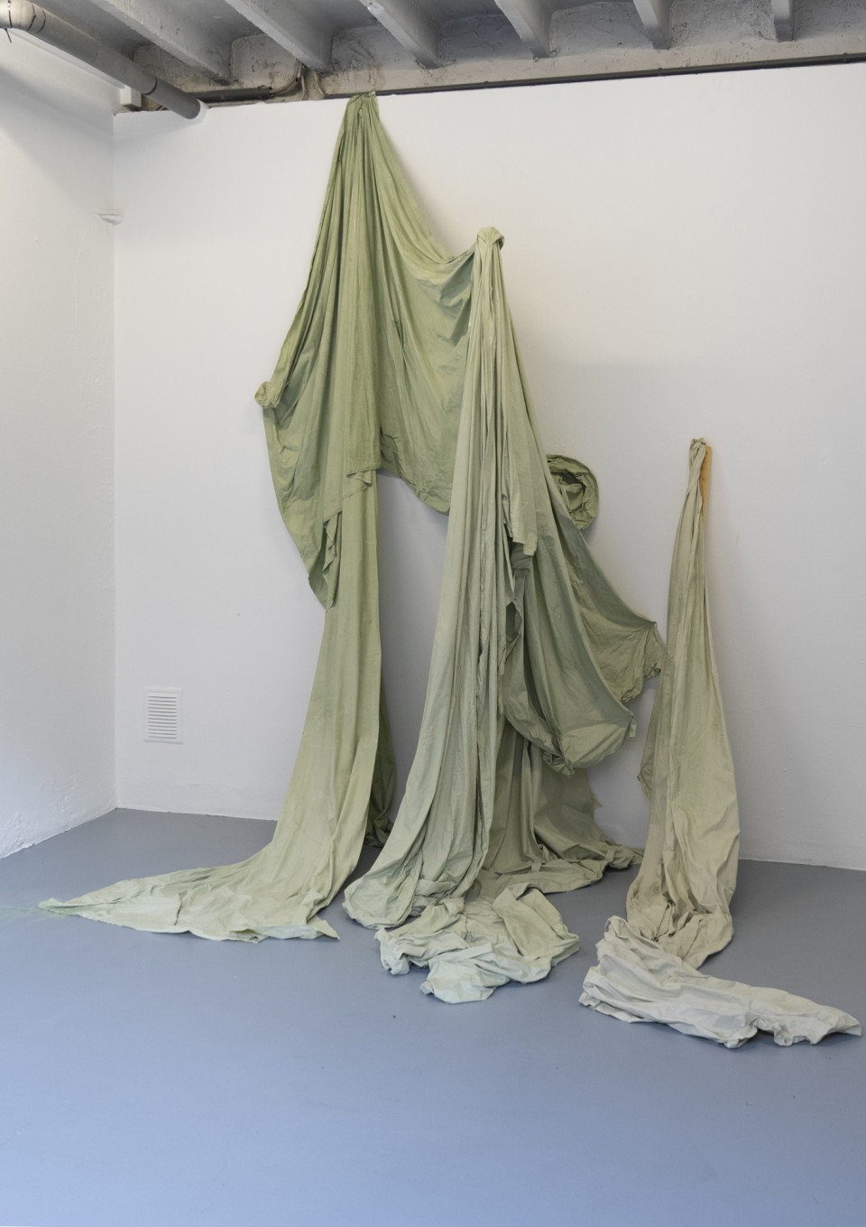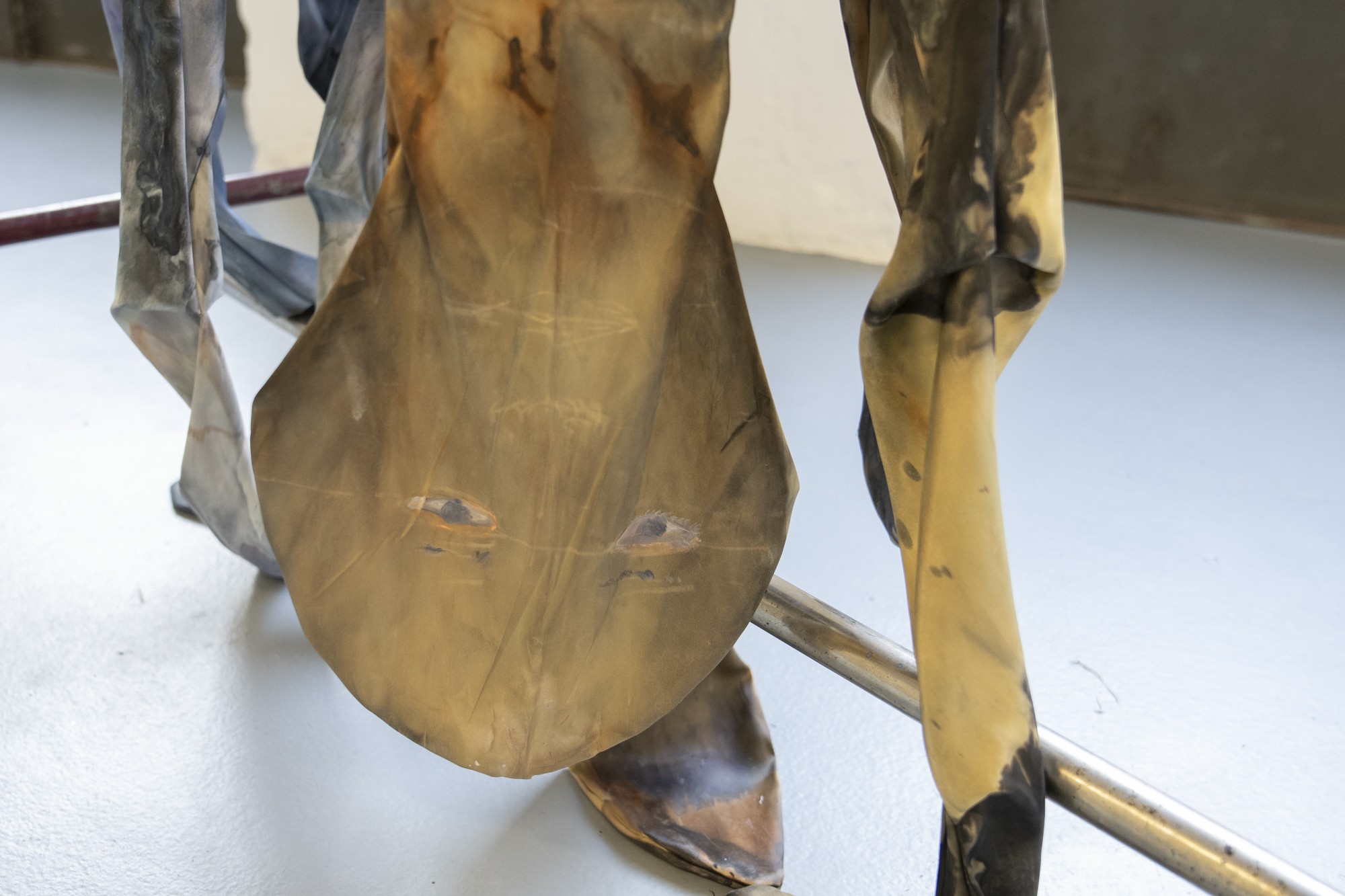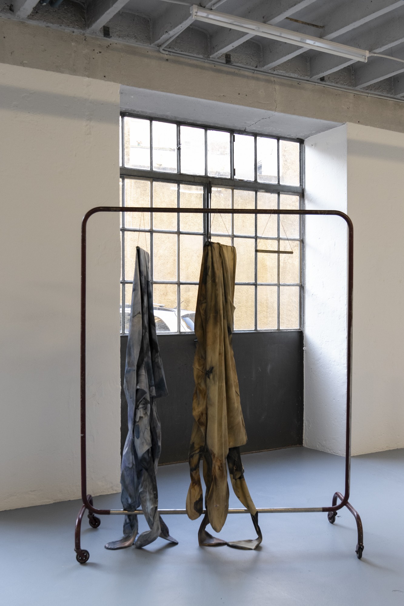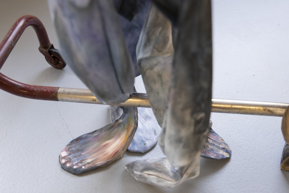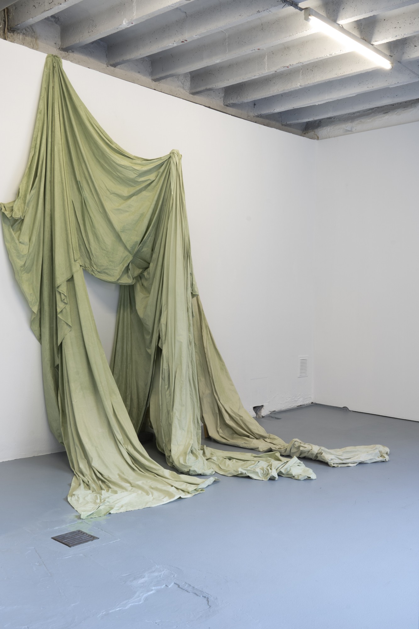 Il y a dans le travail de Céline Peruzzo une désarmante déambulation entre les époques, elle fait référence avec ses «dipinti» aux drapés antiques qui se figent sur des statues de déesses grecques, elle nous prépare des costumes démesurés de femmes grenouilles d’un temps futuriste et nous rappelle au modernisme avec sa tête à la Brancusi. Les références sont affichées, ce sont des hommages, des déambulations dans l’histoire de l’art. Céline met en place des accessoires, des objets, un décor pour une pièce de théâtre imaginaire, une scène dans laquelle les protagonistes étaient/sont/seront des femmes.