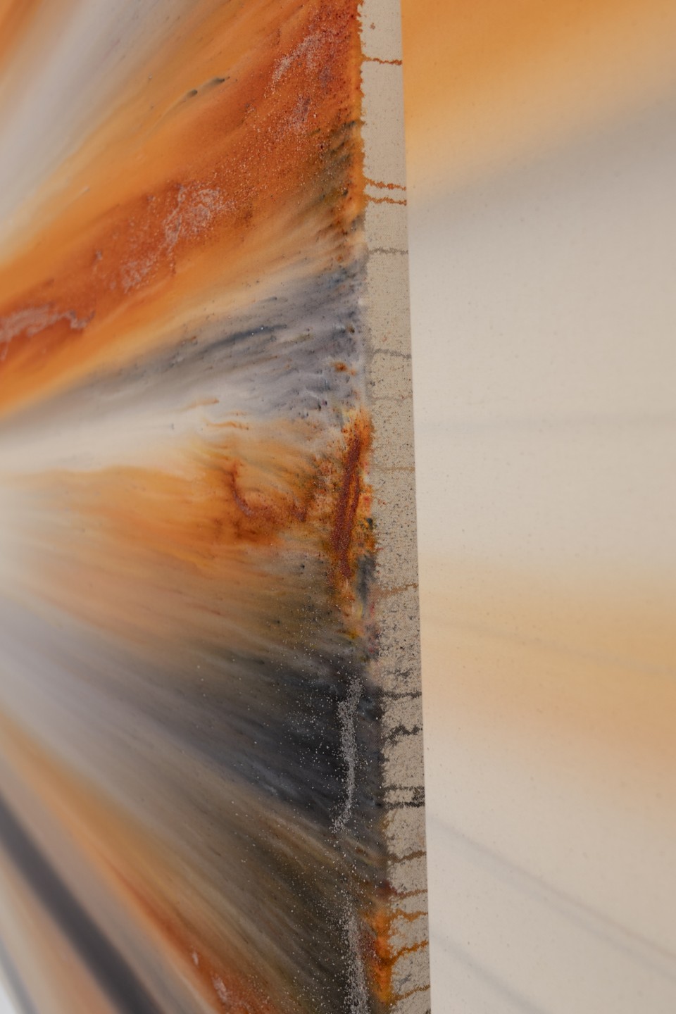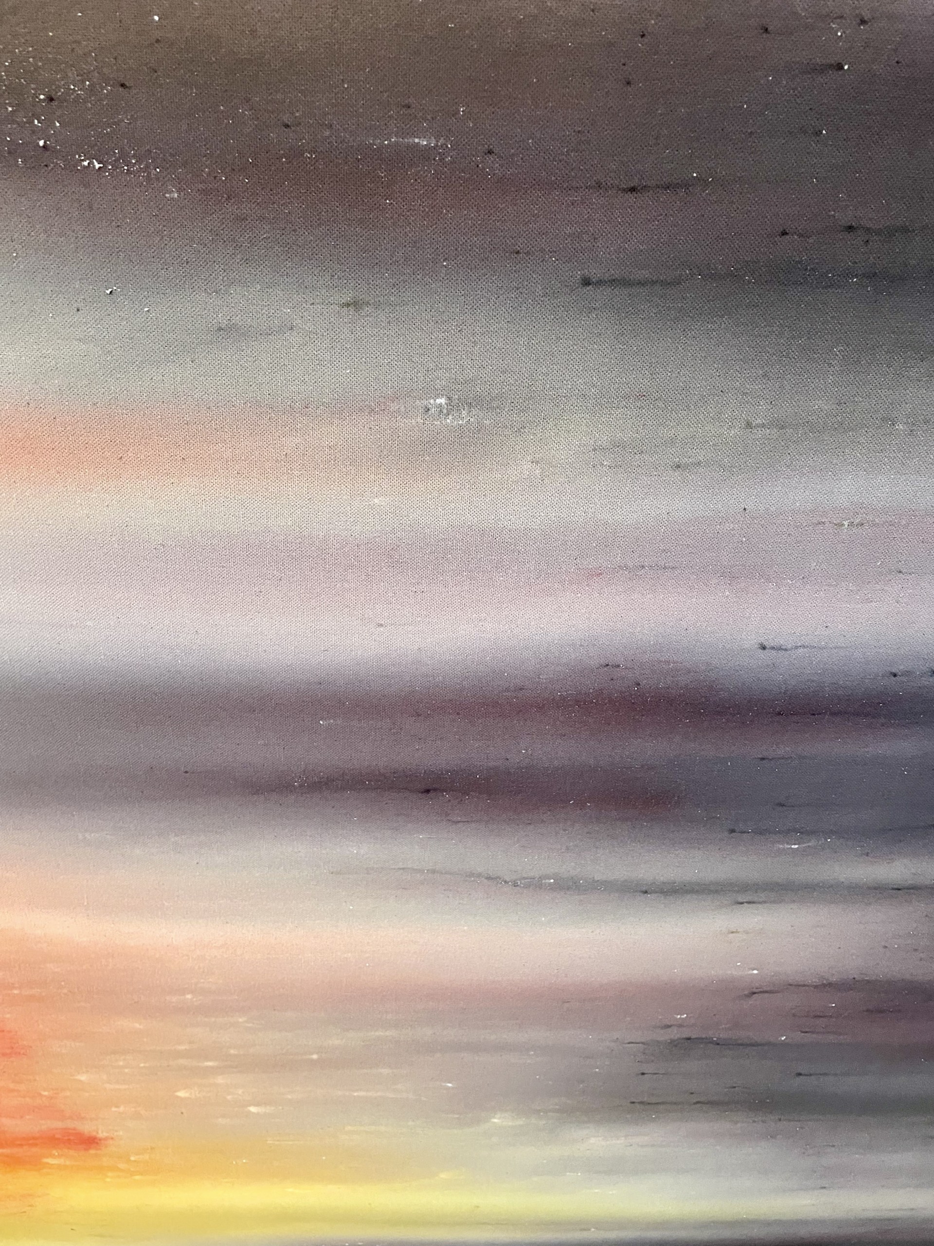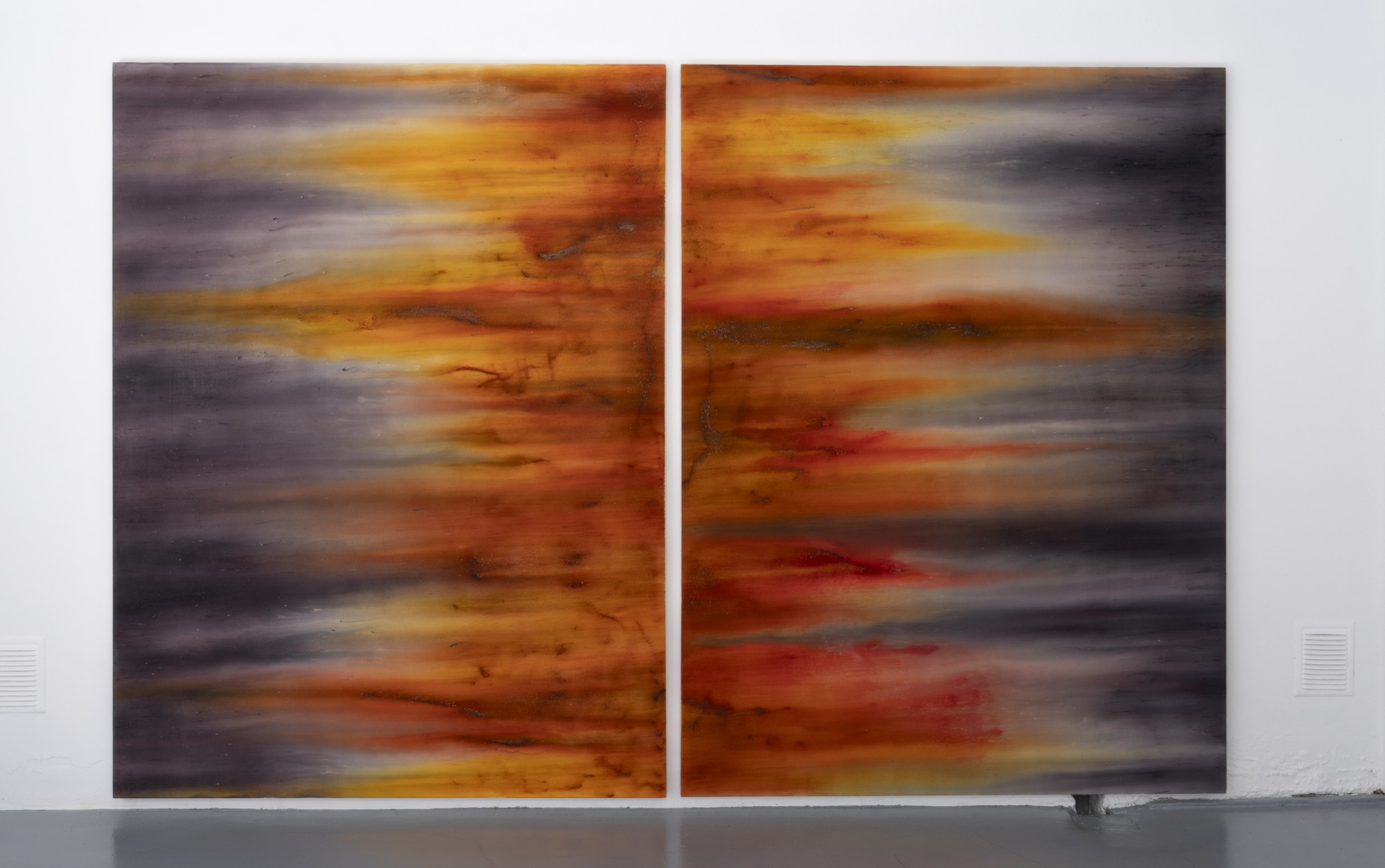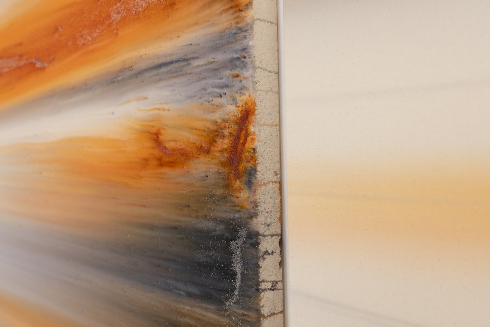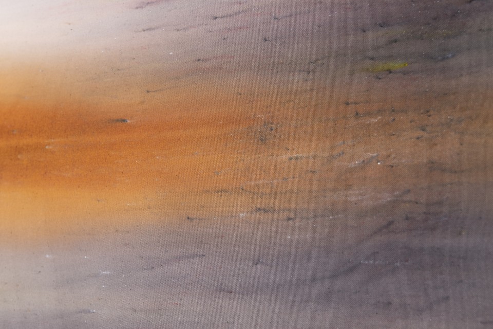 Lorsque l’on voit de près ces tableaux peints, ou plutôt teints et déteints, l’une des premières surprises